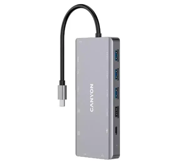 <p>13-portowy HUB Canyon USB-C DS-12. Maksymalna funkcjonalność dla Twoich gadżetów w jednym miejscu!</p><p>Zyskaj pełną kontrolę nad podłączonymi urządzeniami dzięki wszechstronnemu hubowi Canyon DS-12. Z jego 13 portami i obsługą 4K Ultra HD, czytnikami kart oraz możliwością podłączenia dwóch monitorów, korzystanie z wielu urządzeń stanie się dla Ciebie niezwykle komfortowe i efektywne. Elegancka aluminiowa obudowa dodaje stylu a "Plug and Play" gwarantuje bezproblemowe korzystanie od pierwszego podłączenia.</p><p>13 portów dla maksymalnej elastyczności.</p><p>Hub DS-12 został stworzony z myślą o pełnej kompatybilności bez ograniczeń z różnymi urządzeniami. Bez względu na to, czy używasz komputera, tabletu czy smartfona. Hub DS-12 od Canyon obsłuży wszystko co potrzebujesz. Hub oferuje 13 różnych portów, umożliwiając jednoczesne podłączenie różnorodnych urządzeń peryferyjnych.</p><p>Ładowanie USB-C PD 100 W i Gigabit Ethernet.</p><p>Port USB-C PD o mocy 100 W zapewnia szybkie i efektywne ładowanie dla podłączonych urządzeń. Zintegrowany port Gigabit Ethernet umożliwi Ci bezpośrednie połączenie z internetem, zapewniając stabilną i szybką transmisję danych.</p><p>Kompatybilność z Samsung DEX i Nintendo Switch.Aluminiowa obudowa - trwałość i elegancja.</p><p>Hub Canyon DS-12 jest kompatybilny z Samsung DEX i Nintendo Switch co dodatkowo zwiększa jego funkcjonalność. Solidna aluminiowa obudowa nie tylko dodaje elegancji, ale także tłumi zakłócenia w transmisji sygnału.</p><p>2 porty 4K Ultra HD - podłączanie 2 monitorów. Wysoka rozdzielczość obrazu.</p><p>Hub DS-12 oferuje dwa porty HDMI, króre umożliwią Ci podłączenie jednocześnie dwóch monitorów 4K Ultra HD i zapewni wyjątkową jakość przesyłanego obrazu.</p><p>3 porty USB-A 3.0 i 1 x USB-A 2.0. Audio 3,5 mm. Czytniki kart SD, micro SD.Transfer danych USB-C i transmisja danych VGA.</p><p>Trzy porty USB-A 3.0 i jeden USB-A 2.0 umożliwiają jednoczesne podłączenie różnorodnych urządzeń USB. Port audio 3,5 mm umożliwia podłączenie słuchawek lub głośników, zapewniając pełne doznania dźwiękowe. Gniazda czytników kart SD i Micro SD ułatwiają natychmiastowe przesyłanie dużych ilości danych. Port USB-C umożliwia szybki transfer danych i złącze VGA umożliwia transmisję wideo</p><p>Tryb "Plug and Play" bez dodatkowego oprogramowania.</p><p>Natychmiast przystąp do działania! Hub DS-12 działa w trybie "Plug and Play" i nie potrzebujesz dodatkowego oprogramowania. Po prostu podłącz urządzenia i ciesz się maksymalną funkcjonalnością.</p>