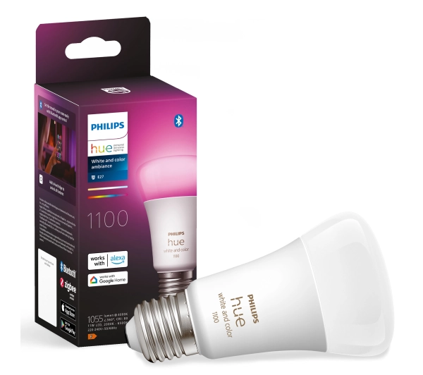 <h2>Smart home</h2><p>zaczyna się od światła</p> <h2>Philips Hue White and color ambiance Żarówka E27 1100lm</h2><ul> <li>16 mln kolorów i wszystkie odcienie bieli</li> <li>Możliwość przyciemniania</li> <li>Łatwe sterowanie przez Bluetooth</li></ul> <h2>Łatwy start dzięki Bluetooth</h2><p>Tworzenie dowolnych aranżacji, sterowanie do 10 świateł Hue za pomocą aplikacji mobilnej Philips Hue (dostępna na iOS i Android).</p> <h2>Stwórz wyjątkowy nastrój za pomocą kolorowego światła</h2><p>16 mln kolorów to nieskończone możliwości świetlnych aranżacji. Możesz zmienić kolor jednego światła, wybrać w aplikacji jedną ze scen lub tworzyć własne, unikalne kompozycje.</p> <h2>Szeroka paleta światła białego</h2><p>Od ciepłej po chłodną biel, z możliwością przyciemniania, dostosowania odcienia oraz intensywności oświetlenia.</p> <h2>Steruj światłem jak chcesz</h2><p>Przez aplikację mobilną, akcesoria sterujące czy głosowo (kompatybilne z Apple HomeKit*, Google Assistant, Amazon Alexa).</p><p>*wymaga mostka Hue Bridge</p> <h2>Najważniejsze parametry</h2><ul> <li>Temperatura światła: 2000-6500K</li> <li>16 milionów kolorów</li> <li>Żarówka z gwintem E27</li> <li>9W</li> <li>220-240V</li> <li>Kształt: A60</li></ul>Zawartość opakowania<p>1x żarówka Philips Hue White and color ambiance A60 E27 1100lm</p> <h2>Wybierz opcję najlepszą dla siebie</h2> <h2>Mostek Philips Hue- odblokuj wszystkie możliwości inteligentnego oświetlenia</h2><p>Synchronizuj światło z filmem, grą, a nawet muzyką i poznaj nową jakość rozrywki. Zyskaj możliwość sterowania oświetleniem będąc nawet poza domem. Ustawiaj automatyczne harmonogramy i korzystaj ze wszystkich możliwości inteligentnego oświetlenia.</p><p>Mostek Hue jest sprzedawany oddzielnie.</p>