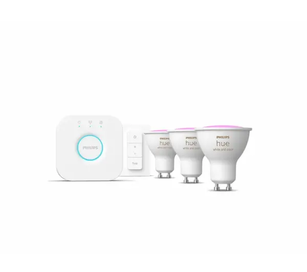 <h2>Philips Hue White and Colour Ambiance GU10 3szt. + Regulator przyciemniania Dimmer switch</h2> Z Philips Hue White and Colour Ambiance GU10 3szt. + Regulator przyciemniania Dimmer switch możesz tworzyć niepowtarzalne aranżacje świetlne. Zestaw umożliwia łatwy dobór oświetlenia w zależności od pory dnia czy wykonywanej czynności. Zaprogramowane aranżacje świetlne pozwalają dopasować rodzaj oświetlenia do codziennych zajęć Twórz wyjątkowe kompozycje o nastroju odpowiednim na każdą okazję. Łatwe sterowanie oświetleniem za pomocą asystenta głosowego Amazon Alexa lub Google Assistant Podkreśl atmosferę wnętrza korzystając z niezliczonych opcji kolorowego oświetlenia Zsynchronizuj kolor i natężenie światła z rytmem muzyki lub obrazem na ekranie <h2>Poznaj zestaw Philips Hue White and Colour Ambiance GU10 3szt. + Regulator przyciemniania Dimmer switch</h2> Oświetlenie na miarę Twoich potrzeb Zestaw Philips Hue White and Colour Ambiance GU10 3szt. + Regulator przyciemniania Dimmer switch odmieni Twój dom za pomocą wyjątkowych aranżacji świetlnych. Dzięki czterem zaprogramowanym konfiguracjom możesz dopasować światło do swoich codziennych czynności. Dwie chłodne barwy światła białego pozwolą Ci energicznie zacząć nowy dzień lub skoncentrować się w trakcie pracy. Natomiast cieplejsze barwy uprzyjemnią wieczorny relaks i zapewnią komfort podczas lektury. Wciągające aranżacje świetlne Twórz fascynujące aranżacje świetlne i baw się kolorami w swoim domu! Philips Hue White and Colour Ambiance GU10 3szt. + Regulator przyciemniania Dimmer switch oferuje aż 16 milionów barw, pozwalając na dowolne konfiguracje. Możesz skorzystać z zaprogramowanych przez producenta scen kolorystycznych lub puścić wodze fantazji i wykreować własne efekty świetlne. Sterowanie głosowe Z Philips Hue White and Colour Ambiance GU10 3szt. + Regulator przyciemniania Dimmer switch sterowanie oświetleniem w domu jest zaskakująco proste! Urządzenie współpracuje z popularnymi asystentami głosowymi Amazon Alexa i Google Assistant. Wystarczy sparować je z kompatybilnym urządzeniem Google Nest lub Amazon Echo, aby kontrolować oświetlenie za pomocą łatwych poleceń głosowych. Perfekcyjna synchronizacja Zgraj oświetlenie Philips Hue White and Colour Ambiance GU10 3szt. + Regulator przyciemniania Dimmer switch z dźwiękiem lub obrazem z komputera czy telewizora i ciesz się wciągającą grą świateł i kolorów! Światła mogą dynamicznie zmieniać natężenie i barwę w rytm muzyki albo reagować na sceny pojawiające się na ekranie. Światło na każdą porę dnia Philips Hue White and Colour Ambiance GU10 3szt. + Regulator przyciemniania Dimmer switch oferuje szeroką paletę odcieni białego światła, dzięki czemu możesz stworzyć w domu atmosferę sprzyjającą pracy i koncentracji. Zmieniaj odcień i intensywność oświetlenia, aby zapewnić sobie komfortowe warunki niezależnie od pory dnia. Inteligentne zarządzanie Znajdujący się w zestawie Philips Hue White and Colour Ambiance GU10 3szt. + Regulator przyciemniania Dimmer switch mostek Hue steruje wszystkimi funkcjami oświetlenia. Ten niewielki element współpracuje z inteligentnymi żarówkami, lampami, akcesoriami oraz dedykowaną aplikacją mobilną, dzięki czemu cały system działa płynnie i niezawodnie. Pomaluj swoją przestrzeń Stwórz energetyczne oświetlenie na imprezę albo skomponuj niepowtarzalną aranżację, która podkreśli nastrój romantycznego wieczoru we dwoje! Z Philips Hue White and Colour Ambiance GU10 3szt. + Regulator przyciemniania Dimmer switch Twoja przestrzeń nabierze barw. Korzystaj z milionów dostępnych opcji kolorystycznych, aby wykreować efekty świetlne dopasowane do każdej okazji. Jednym dotknięciem możesz całkowicie odmienić atmosferę panującą we wnętrzu! <h2>Zawartość opakowania Philips Hue White and Colour Ambiance GU10 3szt. + Regulator przyciemniania Dimmer switch</h2> W opakowaniu Kabel Ethernet Mostek HUE Regulator przyciemniania Hue Zasilacz Żarówki Philips – marka godna zaufania Znana marka Globalne zasięgi i uznanie na całym świecie Niezawodne produkty Producent innowacyjnej elektroniki użytkowej i sprzętu domowego Wieloletnie zaufanie konsumentów Potwierdzone licznymi pozytywnymi recenzjami i nagrodami