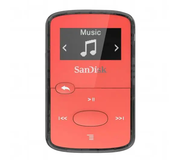 <h2>SanDisk Clip Jam 8GB (czerwony)</h2>Urządzenie z pamięcią 8 GB pomieści kolekcję utworów czy audiobooków i umożliwi odtwarzanie ich w dowolnym miejscu. Dzięki MP3 SanDisk Clip Jam posłuchasz też radia, gdyż model ten dysponuje wbudowanym tunerem FM. Naładuj wewnętrzny akumulator oraz ciesz się kompletnym, cyfrowym brzmieniem przez nawet 18 godzin.8 GB miejsca do przenoszenia nawet 2000 plików muzycznychTuner FM - radiowe programy informacyjne i listy przebojów zawsze w zasięguLekka obudowa z klipsem do wygodniejszego podróżowania z muzykąIntuicyjna obsługa z pomocą 1-calowego ekranuOpcja rozbudowy pamięci przy użyciu karty microSDWytrzymała bateria, zapewniająca energię na nawet 18 godzin słuchania<h2>Poznaj odtwarzacz MP3 SanDisk Clip Jam</h2> Swoboda słuchaniaZapomnij o nudzie w trakcie ćwiczeń, spacerów bądź dojazdów do szkoły - z SanDisk Clip Jam rozrywkowe treści audio będą zawsze pod ręką. Do pamięci przenośnego odtwarzacza MP3 wgrasz nawet 2000 kompozycji muzycznych, podcastów czy audiobooków o łącznym rozmiarze 8 GB. Wszystko to bez konwersji formatów, gdyż produkt wspiera pliki MP3, WMA, rozszerzenia iTunes (ACC) a nawet książki mówione Audible. Radiowe emocjeZłap SanDisk Clip Jam, aby poznać najnowsze wydarzenia, popowe hity i sukcesy ulubionych zespołów sportowych - wszystko co musisz zrobić, to ustawić częstotliwość FM stacji radiowej transmitującej mecz piłkarski bądź notowanie z listą przebojów. Odbiór dźwięku z dala od zniekształceń zapewni komfort zabawy, gdy podróżujesz, wędkujesz lub spędzasz czas na działce. Konstrukcja dla aktywnychObudowę odtwarzacza SanDisk Clip Jam zintegrowano z solidnym klipsem mocującym umożliwiającym przypięcie produktu do ubrania. Zawieś go na koszuli, spodniach bądź pasku plecaka, a zyskasz dodatkową przestrzeń w kieszeniach. Kompaktowy sprzęt o wadze zaledwie 23 gramów zapewni swobodę ruchów zarówno podczas codziennej pracy, jak i w trakcie wchodzenia na górki szczyt. Funkcjonalny wyświetlaczChcesz przypomnieć sobie melodię wybranego utworu? Z pomocą SanDisk Clip Jam znajdziesz ją w mgnieniu oka. Wszystko za sprawą łatwego w obsłudze menu, wyświetlanego na ekranie OLED w rozmiarze 1 cala. Jasne podświetlenie pozwoli przejrzeć pozycje z kolekcji nawet w kompletnej ciemności. Jeśli album zawiera okładkę płyty, jej kolorowe detale ujrzysz przed sobą. Złącze microSDUsuwanie plików, by zrobić miejsce na nowe treści to już przeszłość - konstruktorzy odtwarzacza MP3 SanDisk Clip Jam zadbali o możliwość szybkiej rozbudowy pamięci przy użyciu nośnika w standardzie microSD lub microSDHC. Wsuń kartę do pasującego gniazda, a już po chwili dostępna przestrzeń zostanie rozszerzona o nawet 32 GB. Do wgrania zawartości wystarczy komputer i dołączony kabel USB. Energia do zabawySanDisk Clip Jam to propozycja dla osób, które lubią długą, nieprzerwaną zabawę. Wytrzymały akumulator gromadzi moc na nawet 18 godzin ciągłego słuchania. Bliskie sercu przeboje będą towarzyszyły Ci zatem przez cały popołudnie i wieczór. Ogniowo wielokrotnego ładowania pozwala zapomnieć o kłopotach czy kosztach związanych z wymianą baterii.<h2>Zawartość opakowania SanDisk Clip Jam</h2>W opakowaniu Odtwarzacz MP3 Kabel USB Słuchawki Instrukcja obsługi w języku polskim Karta gwarancyjnaSanDisk – marka godna zaufaniaiaNiezawodność przede wszystkimPamięci masowe cenione przez profesjonalistówSprawdzona ochrona plikówTechnologie do bezpiecznego przechowywania danych, rozwijane od ponad 25 latPrzekracza graniceWyjątkowe odtwarzacze multimediów dla sportowców i podróżników