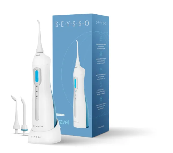 <h2>SEYSSO Oxygen Travel to irygator, który sprawdzi się w każdym domu. Urządzenie wspomaga codzienne dbanie o higienę jamy ustnej. Strumień wody pod ciśnieniem efektywnie usuwa resztki jedzenia oraz nieczystości z przestrzeni międzyzębowej i dziąseł.</h2><h3>Poznaj irygator SEYSSO Oxygen Travel</h3><p>SEYSSO Oxygen Travel to trwały i nowoczesny irygator, który pomoże Ci w walce o zdrowe i białe zęby. Urządzenie poprawia krążenie krwi w okolicach dziąseł, zapewnia świeży oddech, a także usuwa nieczystości i resztki jedzenia. SEYSSO Oxygen Travel to niezbędny produkt dla osób, które noszą aparaty ortodontyczne, mosty i korony.</p><h3>Ciśnienie wody nawet do 6,2 barów</h3><p>Silny strumień wody pod ciśnieniem wypłucze wszelkie pozostałości z przestrzeni międzyzębowej. Możesz regulować ciśnienie od 2,7 do 6,2 barów.</p><h3>3 programy pracy</h3><p>Irygator SEYSSO Oxygen Travel pracuje w 3 trybach, które różnią się od siebie ciśnieniem strumienia wody.</p><ul> <li>Normal - silny strumień wody idealnie nadaje się do czyszczenia zębów z największą dokładnością, nawet w przypadku noszenia aparatu ortodontycznego (6,2 barów)</li> <li>Soft - wyjątkowo delikatny strumień wody o niskim ciśnieniu doskonale sprawdzi się u osób z nadwrażliwością zębów i dziąseł (2,7 barów)</li> <li>Pulse - strumień wody o zróżnicowanym ciśnieniu, który zapewnia delikatny masaż dziąseł i poprawia ich ukrwienie (2,7-6,2 barów)</li></ul><h3>Wyjątkowa precyzja</h3><p>Średnica otworu wylotowego irygatora ma jedynie 0,6 mm, dzięki czemu strumień wody jest idealnie skupiony i ukierunkowany tam, gdzie powinien. Dzięki temu wyczyścisz swoje zęby jeszcze skuteczniej.</p><h3>Wygodny zbiornik na wodę</h3><p>Zbiornik na wodę o pojemności 150 ml można z łatwością odłączyć od urządzenia i napełnić, co sprawia, że korzystanie z irygatora SEYSSO Oxygen Travel jest niezwykle proste i wygodne.</p><h3>Pojemny akumulator i wygodne ładowanie</h3><p>Irygator SEYSSO Oxygen Travel może działać nieprzerwanie nawet do 70 minut! Daje to 14 dni pracy (przy korzystaniu około 2 minut dziennie) bez konieczności ładowania! Dzięki temu urządzenie jest mobilne i doskonale sprawdzi się w podróży. Dodatkowo w zestawie znajduje się stacja dokująca z ładowarką indukcyjną.</p><h3>Ergonomiczny kształt</h3><p>SEYSSO Oxygen Travel to irygator, który został zaprojektowany tak, aby spełniał wszystkie cechy urządzenia przenośnego. Lekka konstrukcja i ergonomiczny kształt zapewnia maksymalną wygodę nawet podczas długich wyjazdów.</p><h3>Zobacz, co otrzymasz w zestawie:</h3><ul> <li>Korpus irygatora</li> <li>Zbiornik na wodę</li> <li>Trzy końcówki do irygatora – standardowa, do kieszonek dziąsłowych i do aparatów ortodontycznych</li> <li>Ładowarka indukcyjna</li> <li>Instrukcja obsługi</li></ul>