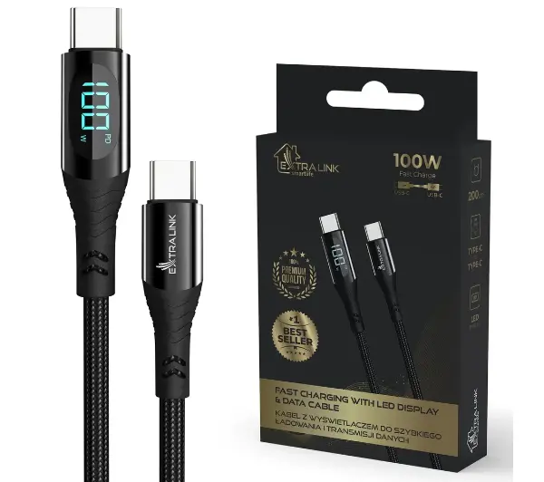 <h2>Pełna kontrola nad ładowaniem</h2><p>Wbudowany wyświetlacz LED umożliwia monitorowanie napięcia w czasie rzeczywistym. To niezwykle praktyczne rozwiązanie, które zapewnia użytkownikowi kontrolę i wygodę w jednym.</p><h2>Imponująca moc</h2><p>Kabel Extralink USB-C do USB C to nie tylko narzędzie do łączenia, lecz także przykuwające uwagę z uwagi na swoją potężną moc 100W. Dzięki długości 2 metrów, jest niezwykle elastyczny i wygodny w użyciu. Obsługa technologii Quick Charge 3.0 umożliwia błyskawiczne i wydajne ładowanie nie tylko telefonów, lecz również większych sprzętów, na przykład laptopów. Szybkie przesyłanie danych już nie stanowi problemu.</p><h2>Solidna i trwała konstrukcja</h2><p>Kabel Extralink zachwyca swoją niezwykłą siłą, ale również posiada solidną budowę. Przeznaczony do długotrwałego użytkowania, zawsze będzie działał bez zarzutu. Czarny kolor dodaje mu elegancji, jednocześnie ukrywając ślady użytkowania. Spełni oczekiwania nawet najbardziej wymagających użytkowników.</p><h2>2 metry swobody i pełna kompatybilność</h2><p>Długi, 2 metrowy kabel zapewnia swobodę korzystania z urządzeń z odległości. Poczuj elastyczność i swobodę dzięki kablowi Extralink, który eliminuje wszelkie ograniczenia. Wbudowane zabezpieczenia zapewniają wysoki poziom bezpieczeństwa podczas użytkowania. Kabel jest kompatybilny z wszystkimi urządzeniami z gniazdem USB-C.</p><h2>Specyfikacja</h2><ul> <li> Marka: Extralink </li> <li> Model: CABESL04 </li> <li> Długość: 2m </li> <li> Materiał: Nylon </li> <li> Moc: 100W </li> <li> Prędkość transmisji danych: 480Mbps </li> <li> Kolor: Czarny </li> <li> Średnica przewodu: 3,8mm </li> <li> Złącza: USB C - USB C </li></ul>