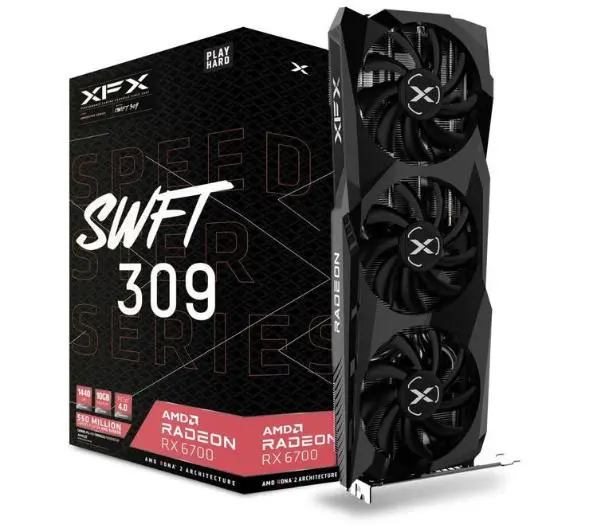 <h2>XFX Radeon RX 6700 CORE Gaming SWFT 309 10GB GDDR6 160bit</h2>Szukasz fenomenalnych wrażeń podczas grania? Zapewni ci je karta graficzna XFX Radeon RX 6700 CORE Gaming SWFT 309 bazująca na architekturze AMD RDNA 2. Dzięki zaawansowanym technologiom i funkcjom, w które została wyposażona, zachwycisz się jakością obrazu i pokochasz gaming na nowo.Architektura AMD RDNA 2, czyli ogromna moc i świetna jakośćKonstrukcja, która nie tylko zapewnia wydajne chłodzenie, ale również dobrze wyglądaJeszcze więcej możliwości dzięki rozbudowanym funkcjom od AMDTechnologie FidelityFX Super Resolution (FSR) i Radeon Super Resolution (RSR) dla doskonałych wrażeńWyjątkowy realizm obrazów – wsparcie sprzętowego ray tracingu<h2>Poznaj kartę graficzną XFX Radeon RX 6700 CORE Gaming SWFT 309</h2> Solidna podstawa, doskonałe efektyXFX Radeon RX 6700 CORE Gaming SWFT 309 została stworzona na bazie AMD RDNA 2, czyli architektury, na której opiera się wiele zaawansowanych układów nowej generacji. Porównując ją z poprzednią architekturą, zdecydowanie można mówić o przełomie. Za dużą poprawę wydajności i jeszcze lepszą jakość grafiki odpowiadają między innymi ulepszone jednostki obliczeniowe, a także zastosowanie nowych technologii, np. AMD Infinity Cache. Duża efektywność chłodzeniaXFX Radeon RX 6700 CORE Gaming SWFT 309 bez wątpienia przyciąga uwagę designem. Trzeba jednak podkreślić, że projekt został bardzo dobrze przemyślany – tak aby znaleźć równowagę pomiędzy wyglądem a funkcjonalnością. Właśnie dlatego na obudowie karty graficznej zauważyć można liczne otwory, które poprawiają obieg powietrza, a tym samym znacznie usprawniają rozprowadzanie (do którego wykorzystywane są trzy wentylatory) nagromadzonego ciepła. Więcej, czyli lepiejZ kartą graficzną XFX Radeon RX 6700 CORE Gaming SWFT 309 zwiększenie liczby FPS jest możliwe za sprawą wsparcia zaawansowanych funkcji proponowanych przez AMD. Więcej klatek generowanych w ciągu sekundy (co jest równoznaczne z większą płynnością obrazu) to jednak niejedyna korzyść płynąca z zastosowania takiego rozwiązania. Równie istotna jest możliwość wykorzystania większej mocy obliczeniowej do renderowania efektów graficznych, co także przekłada się na jakość wrażeń płynących z rozgrywki. Precyzyjne skalowanieFidelityFX Super Resolution (FSR) jest jedną z opracowanych przez AMD technologii, które są obsługiwane przez XFX Radeon RX 6700 CORE Gaming SWFT 309. To właśnie FSR pozwala poprawić jakość i płynność obrazu w wybranych grach – a to za sprawą skalowania do wyższej rozdzielczości i generowania większej liczby klatek na sekundę. Płynność bez ograniczeńOsiągnięcie niemal takich samych efektów jak w przypadku FidelityFX Super Resolution (FSR) umożliwia również funkcja Radeon Super Resolution (RSR). Działa ona na podstawie dosłownie identycznego algorytmu, jednak bazuje na sterowniku, a co za tym idzie – pozwala na skalowanie do wyższej rozdzielczości i zwiększenie FPS w niemal wszystkich produkcjach. Zaawansowane, wyjątkowe rozwiązaniaXFX Radeon RX 6700 CORE Gaming SWFT 309 zapewnia dostęp do zaawansowanych technologii. Dzięki AMD FreeSync szybkość generowania klatek na sekundę jest zsynchronizowana z częstotliwością odświeżania monitora, a Radeon Anti-Lag pozwala ograniczyć opóźnienia i przyspieszyć czas reakcji. Za możliwość przesyłania obrazu w wysokiej jakości odpowiada natomiast wsparcie dla HDMI 2.1 VRR. Nieprzeciętny realizm obrazówPozwól się zachwycić znakomitym realizmem generowanych obrazów. Architektura AMD RDNA 2 umożliwiła wdrożenie technologii Ray Accelerator. Dzięki temu karta graficzna XFX Radeon RX 6700 CORE Gaming SWFT 309 obsługuje tzw. ray tracing, czyli technologię śledzenia promieni w czasie rzeczywistym. Co więcej, zastosowanie takiego rozwiązania pozwoliło zwiększyć wydajność pracy karty.<h2>Zawartość opakowania XFX Radeon RX 6700 CORE Gaming SWFT 309</h2>W opakowaniu Karta graficzna Instrukcja obsługiXFX – marka godna zaufaniaGaming na wysokim poziomieMarka dostarczająca zaawansowane rozwiązania stworzone z myślą o graczachLata doświadczenia i globalny zasięgFirma założona w 2001 roku, z której produktów korzystają gracze z całego świataGwarancja doskonałych wrażeńWyrażenie „Extreme Effects” jako inspiracja dla nazwy marki