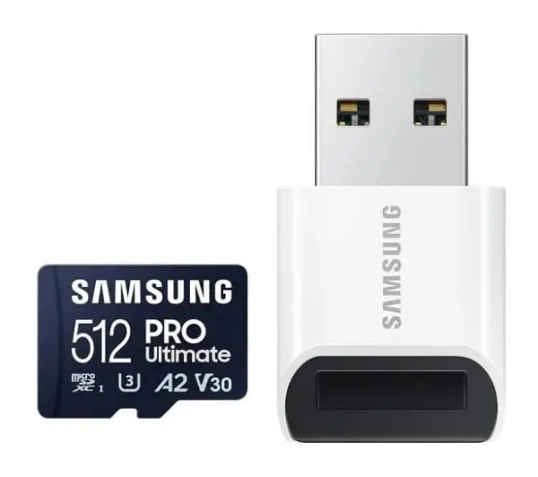 <h2>Samsung PRO Ultimate microSD 512GB + czytnik</h2> Poznaj kartę pamięci, która okaże się świetnym wyborem zarówno do smartfonów i tabletów, jak i dronów oraz kamer sportowych. Samsung PRO Ultimate microSD to model oferujący wysokie maksymalne i minimalne prędkości odczytu oraz zapisu, dlatego świetnie radzi sobie przy wymagających zadaniach i przetwarzaniu plików o dużej rozdzielczości. Łatwe dopasowanie dzięki kartom dostępnym w 3 pojemnościach do wyboru – 128, 256 oraz 512 GB Błyskawiczne przetwarzanie danych dzięki maksymalnej prędkość odczytu sekwencyjnego do 200 MB/s Maksymalna prędkość zapisu sekwencyjnego do 130 MB/s dla jeszcze płynniejszej pracy karty Prędkość zapisu na minimalnym poziomie 30 MB/s poświadczona klasą U3 Klasa prędkości V30 pozwala na wygodne używanie karty do kręcenia wideo Karta idealna do smartfonów i tabletów dzięki klasie A2 pozwalającej na wykonywanie ogromnej ilości operacji w ciągu 1 sekundy <h2>Poznaj kartę pamięci Samsung PRO Ultimate microSD</h2> 3 pojemności do wyboru Karta pamięci Samsung PRO Ultimate microSD pozwoli Ci na doposażenie swoich urządzeń w miejsce do przechowywania danych, jakiego potrzebujesz. Prezentowany model jest bowiem dostępny w aż 3 wariantach do wyboru. Możesz zaopatrzyć się więc w kartę o pojemności 128, 256 oraz 512 GB1, w zależności od tego, która z opcji najlepiej sprawdzi się w Twoim sprzęcie fotograficznym, konsoli do gier czy urządzeniach mobilnych. Odczyt nawet do 200 MB/s Zależy Ci na sprawnym przenoszeniu plików pomiędzy urządzeniami? A może chcesz, by Twoja karta pamięci mogła płynnie pracować nawet przy przetwarzaniu dużych plików o wysokiej rozdzielczości? W takim razie wybierz model Samsung PRO Ultimate microSD cechujący się maksymalną prędkością odczytu sekwencyjnego na poziomie aż do 200 MB/s2. Wysoka prędkość zapisu Imponująca okaże się także maksymalna prędkość zapisu oferowana przez produkt Samsung PRO Ultimate microSD. W tym przypadku może ona osiągać wartości na poziomie aż 130 MB/s. To koniec długiego czekania, aż pliki przekopiują się na urządzenia lub na uruchomienie zainstalowanych na karcie pamięci aplikacji! Klasa U3 dla wymagających Szukasz karty, której doskonałej wydajności będziesz pewny niezależnie od sytuacji? W takim razie Samsung PRO Ultimate microSD okaże się dla Ciebie odpowiednim wyborem! Dzięki klasie prędkości U3 gwarantuje minimalną prędkość zapisu na poziomie 30 MB/s, co pozwala np. na robienie wielu zdjęć o wysokiej rozdzielczości i szybkie przesyłanie ich na inne urządzenia. V30 – odpowiednia do kręcenia wideo Karta pamięci Samsung PRO Ultimate microSD znajduje zastosowanie również przy nagrywaniu wideo kamerą, smartfonem czy dronem, nawet w rozdzielczości 4K3! Świadczy o tym klasa prędkości V304, która podpowiada filmowcom, z jaką minimalną prędkością zapisu przy kamerowaniu będą mieli do czynienia. W tym przypadku jest to 30 MB/s. Klasa A2 dla urządzeń mobilnych Prezentowana karta pamięci wzorcowo współpracuje ze smartfonami, tabletami i innymi urządzeniami mobilnymi. Samsung PRO Ultimate microSD zwiększy Twoją przestrzeń na dane, a dzięki klasie A25 nada się również do instalowania gier i aplikacji. Dodatkowo zapewnia minimalny odczyt losowy 4000 IOPS i minimalny zapis losowy 2000 IOPS. Wyjątkowa trwałość Samsung PRO Ultimate microSD zabezpieczy Twoje dane, nawet jeśli będzie narażony na pracę w trudnych warunkach. Prezentowana karta charakteryzuje się wysoką odpornością na wodę, temperaturę, promieniowanie RTG i magnetyczne, wstrząsy, upadek i ścieranie 6, a zatem zachowuje swoje właściwości nawet podczas deszczu czy działania w czasie mrozu i upałów. Z powodzeniem możesz wykorzystać ją zatem np. przy kręceniu wakacyjnej zabawy w morzu. Dowolność zastosowania Wybierz kartę pamięci Samsung PRO Ultimate microSD, by powiększyć pamięć w smartfonie lub tablecie i móc instalować na niej nawet bardzo wymagające aplikacje. Potrzebujesz czegoś do zapisywania filmów i zdjęć o wysokiej rozdzielczości? Produkt znajdzie zastosowanie również w tej sytuacji! Doskonałe parametry techniczne sprawiają, że kartę można wykorzystać również w konsolach do gier, dronach, laptopach czy kamerach sportowych. <h2>Zawartość opakowania Samsung PRO Ultimate microSD 512GB</h2> W opakowaniu Karta pamięci 512GB Czytnik Adapter do SD Samsung – marka godna zaufania Międzynarodowy zasięg Globalna marka z południowokoreańskimi korzeniami Wieloletnie doświadczenie Marka obecna na rynku sprzętu elektronicznego od 1969 roku Doceniana przez klientów Jedna z najbardziej zaufanych i rozpoznawalnych marek na świecie <h2>Informacje dodatkowe</h2> 1. 1 GB = 1 miliard bajtów. Rzeczywista pojemność pamięci może być mniejsza od nominalnej. Część pamięci może zostać wykorzystana przez pliki systemowe i inne funkcje zarządzania pamięcią. 2. Powyższe szybkości odczytu i zapisu są oparte na testach wewnętrznych przeprowadzonych w kontrolowanych warunkach. Rzeczywista szybkość zależy od pojemności karty. Deklarowaną wydajność uzyskano przy zastosowaniu kart microSD PRO Ultimate z czytnikami firmy Samsung. 3. W przypadku urządzeń niekompatybilnych z interfejsem UHS-I, szybkości zależą od parametrów interfejsu. Rejestracja filmów UHD 4K na kartach o pojemności 512, 256 i 128 GB. Zgodność urządzenia hosta może się różnić. 4. Klasa szybkości UHS 3 to wydajność przewidziana do rejestracji filmów UHD 4K w urządzeniach z obsługą standardu UHS. Stale utrzymywana szybkość zapisu 30 MB/s (klasa UHS V30) to wydajność przewidziana do rejestracji filmów w czasie rzeczywistym w urządzeniach z obsługą standardu UHS. Patrz: www.sdcard.org/consumers/speed. 5. Wydajność A2 oznacza odczyt i zapis z prędkościami odpowiednio 4000 i 2000 IOPS. 6. Odporność na wodę: do 7