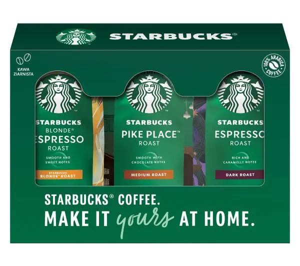 Unikatowy, limitowany zestaw kaw ziarnistych Starbucks®, który idealnie sprawdzi się na prezent! W ramach zestawu dostępne są wszystkie kawy ziarniste Starbucks at Home. Każda kawa Starbucks® ma określony stopień palenia tzw. „Starbucks™ Roast Spectrum”. Dzięki temu zestawowi możesz spróbować kawy ze wszystkich stopni palenia.<ul> <li>Dla fanów delikatnej kawy polecamy Starbucks Blonde® Roast. Ta wyjątkowa mieszanka ziaren z Ameryki Łacińskiej jest ostrożnie palona, aby wydobyć trudne do uchwycenia słodkie i orzeźwiające nuty.</li> <li>Kawa Pike Place™ to delikatna mieszanka ziaren kawy z Ameryki Łacińskiej o subtelnych, lecz bogatych nutach czekolady i prażonych orzechów.</li> <li>Natomiast Espresso Roast to podstawa wszystkich naszych kaw przyrządzanych na bazie espresso. Receptura tej kawy pozwala uzyskać słodycz z nutą karmelu.</li></ul>Zestaw sprawdzi się jako prezent świąteczny, ale także sprosta oczekiwaniom wszystkich gości przy świątecznym stole.