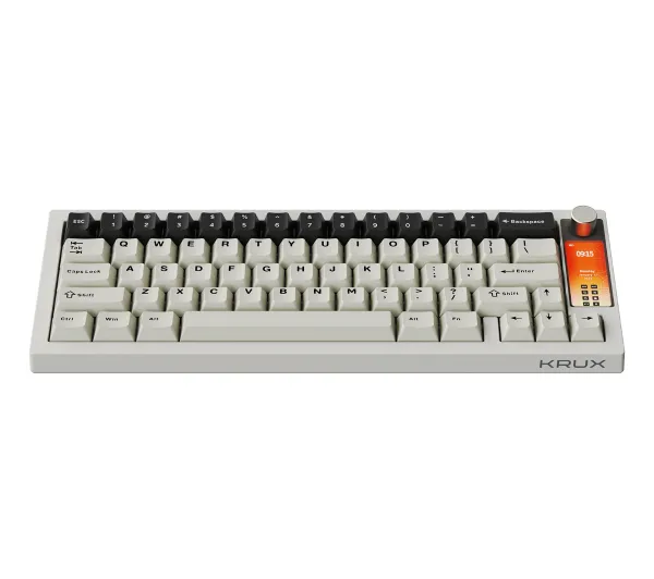 <h2>Krux Drox</h2><p>Krux Drox to bezprzewodowa klawiatura mechaniczna o kompaktowym layoucie 65%, z wielofunkcyjnym pokrętłem i wyświetlaczem obsługującym animacje. Łączy design nawiązujący do stylistyki retro z nowoczesnymi rozwiązaniami potrójną łącznością (kabel USB (Universal Serial Bus), dongiel USB 2,4 GHz (Gigaherc), Bluetooth), konstrukcją typu gasket mount i przełącznikami Krux Violet. Oferuje hot-swap (możliwość wymiany przełączników), podświetlenie ARGB (Addressable Red Green Blue) oraz webowe oprogramowanie.</p> <h3>Wbudowany ekran</h3><p>Klawiaturę wyposażono w zintegrowany pionowy ekran 2,3 cala, który pokazuje m.in. status Caps Lock, Win Lock, akumulatora oraz metodę połączenia. Za jego pośrednictwem można też w szerokim zakresie sterować podświetleniem ARGB i trybem Win/Mac po odpowiednim przestawieniu pokrętła (domyślnie służy do regulacji głośności) czy wyświetlać animacje GIF (Graphics Interchange Format) – na raz można zapisać dwa pliku tego typu i przełączać się pomiędzy nimi.</p><h3>Forma inspirowana retro, nowoczesny charakter</h3><p>Design klawiatury Krux Drox utrzymany w jasnej kolorystyce z ciemniejszymi akcentami nawiązuje do estetyki lat 90., ale nowoczesny wyświetlacz, pełne podświetlenie ARGB i zaawansowane funkcje nadają mu futurystycznego charakteru. Układ 65% to wyjątkowo kompaktowe rozwiązanie, które bez problemu zmieści się na każdym biurku czy w plecaku na laptopa. Solidna konstrukcja z wysokiej jakości tworzywa i efektywne nóżki antypoślizgowe zapewniają stabilność i odpowiednią sztywność nawet podczas intensywnego użytkowania.</p><h3>Trzy tryby łączności– 2,4 GHz, Bluetooth i kabel</h3><p>Drox bez problemu dopasuje się do Twojego stanowiska i stylu pracy oraz grania. Do wyboru masz trzy metody połączenia: bezprzewodowe 2,4 GHz z wykorzystaniem dołączonego dongla USB-A (Universal Serial Bus typu A) (chowany w klawiaturze pod nóżką), Bluetooth z możliwością sparowania do trzech urządzeń oraz kablem przez port USB-C (Universal Serial Bus typu C), którym naładujesz też urządzenie. Możesz wygodnie przełączać się między laptopem, komputerem stacjonarnym, tabletem czy smartfonem– bez przepinania przewodów i bez przestojów w pracy czy rozgrywce.</p><h3>Przełączniki Krux Violet z keycapami PBT (politereftalan butylenu)</h3><p>Sercem klawiatury są mechaniczne przełączniki Krux Violet – liniowe, wyjątkowo gładkie, bez wyczuwalnego punktu aktywacji, z jednostopniową sprężyną i lekką siłą nacisku (43±5 gf (gram-force). Zapewniają bardzo płynny, cichy ruch nawet przy szybkim pisaniu lub graniu – bez agresywnego oporu charakterystycznego dla innych typów konstrukcji. W połączeniu z trwałymi keycapami PBT gwarantują komfort niczym pływanie palcami po klawiaturze, odporność na ścieranie i estetyczny wygląd przez długi czas.</p><h3>Wielowarstwowa konstrukcja gasket</h3><p>Klawiatura wykorzystuje pięciowarstwowy system wypełnienia – PORON (materiał poliuretanowy), IXPE (Irradiated Cross-Linked Polyethylene), silikon, PET (Polyethylene Terephthalate), pianka – i redukuje pogłos oraz niepożądane rezonanse. Konstrukcja z montażem typu gasket dobrze współgra z charakterystyką przełączników Krux Violet, poprawia elastyczność pracy klawiszy i wpływa na bardziej miękki, przyjemny odbiór każdego naciśnięcia. Dzięki temu dźwięk jest ciepły, bez pustego echa czy metaliczności.</p><h3>Hot-swap i akcesoria w zestawie</h3><p>Dzięki funkcji hot-swap wymiana przełączników nie wymaga lutowania wystarczy kilka ruchów, aby zmienić switche w klawiaturze. W zestawie znajdziesz dwa zapasowe switche Krux Violet, przyrząd do wymiany keycapów oraz narzędzie do wyjmowania przełączników.</p>