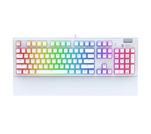 <p>SPC Gear GK650K Omnis Kailh Brown RGB Onyx White Pudding Edition to przykuwająca wzrok, pełnowymiarowa klawiatura mechaniczna (z sekcją numeryczną), która spełni wymagania zarówno graczy, jak i osób, które przy komputerze uczą się bądź pracują. W białej stylistyce nawiązuje do niezwykle rzadkiej, jasnej odmiany onyksu — cennego minerału, znanego ze swojego wyjątkowego wyglądu i wysokiej wytrzymałości. Klawiatura GK650K Omnis Kailh Brown RGB Onyx White Pudding Edition wyróżnia się: wyjątkowym, jasny stylem, trwałymi nakładkami PBT typu „Pudding”, konfigurowalnym podświetleniem RGB (także z boku klawiatury), solidną i zwartą konstrukcją, wzmocnioną przez aluminiowy top, magnetyczną podpórką pod nadgarstki, rolką do regulacji poziomu głośności, jak również funkcjonalnym oprogramowaniem oraz obsługą makr. Dzięki temu GK650K Omnis Kailh Brown RGB Onyx White Pudding Edition sprawdzi się zarówno w pracy lub podczas zajęć szkolnych, jak i do wieczornego grania w ulubione tytułów ze znajomymi. Przełączniki Kailh Brown (brązowe) charakteryzują się zbalansowanym i uniwersalnym działaniem.</p><p>NOWOCZESNY DESIGN W KOLORZE ONYX WHITE</p><p>KLAWIATURA MECHANICZNA Z BLOKIEM NUMERYCZNYM W PEŁNYM WYMIARZE</p><p>18 PREDEFINIOWANYCH TRYBÓW PODŚWIETLENIA</p><p>104 INDYWIDUALNIE PODŚWIETLONE PRZYCISKI (RGB)</p><p>WYSOKA WYTRZYMAŁOŚĆ KONSTRUKCJI</p><p>TRWAŁE NAKŁADKI PBT TYPU „PUDDING”</p><p>PODPÓRKA POD NADGARSTKI</p><p>METALOWA ROLKA GŁOŚNOŚCI</p><p>PRZEŁĄCZNIKI MECHANICZNE KAILH</p><p>ODŁĄCZANY PRZEWÓD</p><p>DWUSTOPNIOWE NÓŻKI</p><p>N-KEY ROLLOVER Z PEŁNYM ANTI-GHOSTINGIEM</p><p>OPROGRAMOWANIE</p><h2>ATRAKCYJNY JASNY DESIGN</h2><p>Styl klawiatury SPC Gear GK650K Omnis Kailh Brown RGB Onyx White Pudding Edition jest inspirowany białą odmianą onyksu — wyjątkowego, niezwykle rzadkiego minerału, znanego ze swojej wytrzymałości i unikatowego wyglądu. Na wzór tego kruszcu, konstrukcja GK650K przepełniona jest białymi, srebrnymi oraz szarymi akcentami. Dzięki takiej stylistyce wpasowuje się w estetycznie zaaranżowane stanowisko komputerowe. Ponadto podświetlone konfigurowalnym RGB nakładki typu Pudding z białymi topami sprawiają, że nie można wobec niej przejść obojętnie — jej wyjątkowy wygląd najbardziej doceni się w nocy.</p><h2>KLAWIATURA MECHANICZNA W PEŁNYM WYMIARZE</h2><p>Pełnowymiarowa klawiatura sprawdzi się nie tylko w grach, ale także w codziennym użytkowaniu. Dzięki blokowi numerycznemu, SPC Gear GK650K Omnis Kailh Brown RGB Onyx White Pudding Edition umożliwia łatwe wpisanie liczb np. do programów biurowych, wykonanie szybkich obliczeń matematycznych czy też przypisanie dodatkowych funkcji w grach. Ponadto, każdy ze 104 przycisków jest indywidualnie podświetlany, co pozwala na dostosowanie stylu iluminacji całej klawiatury pod własne preferencje, a także zwiększa komfort pracy w gorszych warunkach oświetleniowych.</p><h2>NOWOCZEŚNIE I STYLOWO</h2><p>Wygląd klawiatury SPC Gear GK650K Omnis Kailh Brown RGB Onyx White Pudding Edition jest połączeniem klasycznego stylu i gamingowego pazura. Jej ostre zarysowane krawędzie i wyprofilowany aluminiowy top wraz z podpórką na nadgarstki z przetłoczeniami świetnie wyglądają zarówno na biurku gracza jak i w środowisku biurowym. Klawiatura została dodatkowo wyposażona w paski LED RGB umiejscowione po bokach, które rozświetlają i wizualnie wzbogacają stanowisko komputerowe.</p><h2>TRWAŁE I WYJĄTKOWO PREZENTUJĄCE SIĘ NAKŁADKI PBT</h2><p>Klawiatura SPC Gear GK650K Omnis Kailh Brown RGB Onyx White Pudding Edition została wyposażona w białe „keycapy” PBT wykonane w technologii „Double Injection”. W trakcie tego procesu do formy wstrzykuje się dwa warianty kolorystyczne tworzywa jeden po drugim, otrzymując tym samym niepowtarzalne, dwukolorowe wykończenie i dużą sztywność. Nakładki Pudding wzbogacają walory estetyczne stanowiska gracza zarówno w dzień, jak i w nocy. Dzięki swojej trwałości gwarantują również wysoką odporność na wycieranie się klawiszy. Nawet po długotrwałym użytkowaniu „keycapy” zachowają swój unikalny wygląd, który najłatwiej docenić wraz z w pełni konfigurowalnym podświetleniem RGB.</p><h2>PODPÓRKA POD NADGARSTKI</h2><p>Aby poprawić ergonomię klawiatury zarówno w zastosowaniu codziennym jak i podczas grania, do GK650K Onyx White dołączona jest podpórka pod nadgarstki. Magnetyczne mocowania, a także specjalne wyżłobienia w obudowie klawiatury umożliwiają łatwe podpinanie i odpinanie. Zależnie od potrzeby można ją ustawić w dowolnej odległości od urządzenia, a dzięki szerokim nóżkom podpórka stabilnie stoi na blacie biurka. Na topie podkładki znajdują się także trójkątne wyżłobienia nie tylko poprawiające ergonomię, ale również wzbogacające wygląd klawiatury.</p><h2>ROLKA GŁOŚNOŚCI</h2><p>Klawiatura GK650K Omnis Kailh Brown RGB Onyx White Pudding Edition została wyposażona w szeroką metalową rolkę do dostosowywania poziomu dźwięku. Każdy jej ruch jest zaakcentowany wyczuwalnym przeskokiem, co pozwala na precyzyjne ustawienie głośności dźwięku. Sama rolka jest natomiast niezwykle funkcjonalnym dodatkiem — jest zawsze blisko pod ręką, a co za tym idzie nie trzeba odrywać się od rozgrywki w grze aby przyciszyć lub podgłośnić dźwięki.</p><h2>KONFIGUROWALNE PODŚWIETLENIE RGB</h2><p>Konfigurowalne podświetlenie RGB daje niemal nieograniczone możliwości kombinacji kolorystycznych. Dzięki temu można wybrać spośród 18 różnych efektów — od podświetlenia stałego, przez ruchome wzory takie jak fala czy powolna zmiana koloru, aż do podświetlenia reagującego na wciśnięcie konkretnego przycisku. Ponadto wiele z dostępnych trybów podświetlenia oferuje możliwość dostosowania prędkości animacji a nawet koloru. Wszelkich modyfikacji efektów można dokonywać poprzez opr