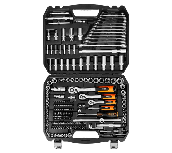 Zestaw kluczy 220 elementów:<ul> <li>klucze płasko-oczkowy 12szt. Rozmiary: 8, 10, 11, 12, 13, 14, 15, 16, 17, 18, 19, 22 mm</li> <li>Nasadki 1/2" 13szt. Rozmiary: 10, 11, 12, 13, 14, 15, 17, 19, 20, 21, 22, 24, 27 mm</li> <li>Nasadki długie 1/2" 5 szt. Rozmiary: 16, 17, 18, 19, 22 mm</li> <li>Grzechotka 1/4" 72 zęby, 155 mm</li> <li>Grzechotka 1/2" 72 zęby, 255 mm</li> <li>Grzechotka 3/8" 72 zęby, 200 mm</li> <li>Nasadki do świec 1/2" 2szt. rozmiary: 16, 21 mm</li> <li>Pokrętło z zabierakiem 1/2" 250 mm</li> <li>Przegub uniwersalny 1/2"</li> <li>Przegub uniwersalny 3/8"</li> <li>Przegub uniwersalny 1/4"</li> <li>Przedłużki 1/2" 2szt. rozmiary: 125, 250 mm</li> <li>Nasadki torx 1/2" 3 szt. rozmiary: E20, E22, E24</li> <li>Nasadki do bitów 1/2" 2szt. rozmiary: T55, T60</li> <li>Nasadki 3/8" 10szt. rozmiary: 10, 11, 12, 13, 14, 15, 16, 17, 18, 19 mm</li> <li>Nasadki długie 3/8" 6szt. rozmiary: 10, 11, 12, 13, 14, 15 mm</li> <li>Nasadki torx 3/8" 6szt. rozmiary: E10, E11, E12, E14, E16, E18</li> <li>Przedłużka 3/8" 150 mm</li> <li>Sześciokątna nasadka do świec zapłonowych 18 mm 3/8"</li> <li>Nasadki 1/4" 13szt. rozmiary: 4, 4.5, 5, 5.5, 6, 7, 8, 9, 10, 11, 12, 13, 14 mm</li> <li>Nasadkik długie 1/4" 7szt. rozmiary: 4, 5, 6, 7, 8, 9, 10 mm</li> <li>Nasadki torx 1/4" 5szt. rozmiary: E4, E5, E6, E7, E8</li> <li>Pokrętło z zabierakiem 1/4" 150 mm</li> <li>Przedłużka 1/4" 2szt. rozmiary: 50, 100 mm</li> <li>Uchwyt do końcówek 3szt. rozmiary: 1/4"&1/4", 3/8"&5/16, 1/2"&5/16"</li> <li>Klucze imbusowe 7szt. rozmiary: 1.27, 1.5, 2, 2.5, 3, 4, 5 mm</li> <li>Magnetyczny uchwyt obrotowy na małe bity ¼”</li> <li>Bity 5/16" 30szt. rozmiary: H5.5, H6, H6.5, H7, H8; M5, M6, M8, M10; T25, T27, T30, T35, T40, T40, T45, T50; T27H, T30H, T35H, T40H, T45H, T50H; PH3, PH4; PZ3, PZ4; SL6, SL6.5, SL8</li> <li>Bity 1/4" 44szt. rozmiary: H5.5, H6, H6.5, H7, H8; M5, M6, M8, M10; T25, T27, T30, T35, T40, T45; T27H, T30H, T35H, T40H, T45H; PH1, PH2, PH3; PZ1, PZ2, PZ3; SL6, SL6.5, SL8; H3H, H4H, H5H, H6H; (口)S1-S2 (凹)4-6-8mm (x)6-8-10mm (Y)1-2-3mm</li> <li>Nasadki do bitów 1/4" 30szt. rozmiary: T25, T27, T30, T35, T40, T40 T45, T50; T27H, T30H, T35H, T40H, T45H, T50H; PH3, PH4 PZ3, PZ4; SL6, SL6.5, SL8; M5, M6, M8, M10; H5.5, H6, H6.5, H7, H8</li> <li>adaptery do wkrętarki na nasadki 3 szt. rozmiary: 1/4", 3/8", 1/2"</li> <li>adapter do wkrętarki na bity</li></ul>