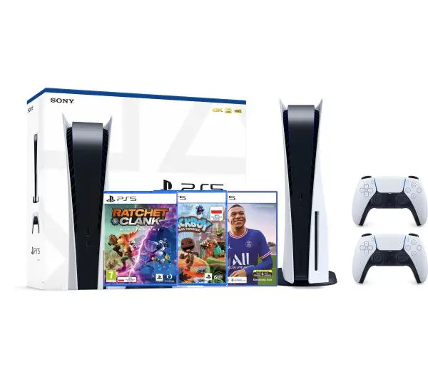 Konsola Sony PlayStation 5 (PS5) z napędem + FIFA 22 + Sackboy + Ratchet & Clank: Rift Apart + Dodatkowy Pad Biały
