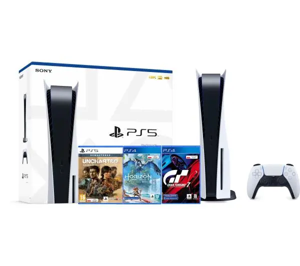 Konsola Sony PlayStation 5 (PS5) z napędem + Gran Turismo 7 + Horizon Forbidden West + Uncharted: Kolekcja Dziedzictwo Złodziei