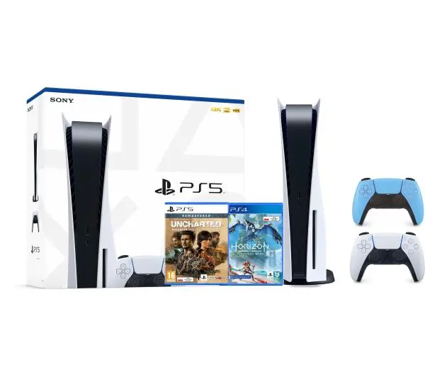 Konsola Sony PlayStation 5 (PS5) z napędem + Horizon Forbidden West + Uncharted: Kolekcja + Dodatkowy Pad Niebieski