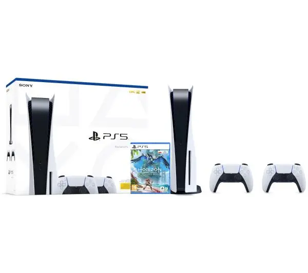 <h2>Sony PlayStation 5 (PS5) z napędem - dodatkowy pad (biały) - Horizon Forbidden West</h2>Wirtualna zabawa w najwyższej jakości? Właśnie taką rozrywkę oferuje Sony PlayStation 5! Dopracowany obraz, otaczający Cię ze wszystkich stron dźwięk, a nawet efekty dotykowe emitowane przez kontroler DualSense sprawiają, że jeszcze mocniej zaangażujesz się w historie przedstawiane na ekranie!Efekty świetlne Ray Tracing połączone z wysoką rozdzielczością obrazu oferowaną przez wyjście 8KMożliwe jest osiągnięcie odświeżania na poziomie 120 Hz przy rozdzielczości 4KUsłysz, skąd nadbiegają wrogowie dzięki technologii przestrzennego dźwięku Tempest 3D AudioTech Efekty dotykowe i wbudowany mikrofon – niezwykłe możliwości kontrolera DualSenseBłyskawiczny dostęp do ulubionych gier zapewnia dysk SSD o pojemności 825 GBCiesz się wirtualną rozrywką w duecie dzięki drugiemu padowi DualSense w zestawieNiezwykła przygoda w postapokaliptyczym świecie – do konsoli dołączono grę Horizon Forbidden West<h2>Poznaj konsolę do gier Sony PlayStation 5</h2> Wysoka rozdzielczośćPoznaj nową jakość ulubionej rozrywki z konsolą do gier Sony PlayStation 5. Została ona wyposażona w wyjście 8K, dzięki któremu obraz może być wyświetlany w zdumiewającej rozdzielczości 4320p! To nie wszystko – technologia Ray Tracing sprawia z kolei, że każdy odblask, odbicie światła na tafli wody, cień i wybuch wyglądają niezwykle realistycznie. Wszystkie złożone efekty świetlne są bowiem odpowiednio regulowane i dopracowane w najmniejszych szczegółach. Technologie obrazuKażda rozgrywka zyska na efektowności z Sony PlayStation 5. Wszystko za sprawą odświeżania obrazu na poziomie 120 Hz przy rozdzielczości 4K – dzięki niemu nawet dynamiczne sceny nie są rozmazane i zyskują na bogactwie detali. Dla jeszcze lepszego efektu podłącz konsolę do telewizora z funkcją HDR – wówczas oprócz wyrazistości zyskasz także szeroką paletę naturalnych barw. Otaczające brzmienieSony PlayStation 5 poradzi sobie z grami obsługującymi technologię Tempest 3D AudioTech. To właśnie w nich możesz liczyć na niezrównaną jakość audio. Przestrzenny dźwięk wzbogaci każdą rozgrywkę sprawiając, że będziesz w stanie precyzyjnie umiejscowić każdy odgłos – spadające krople wody, zbliżające się kroki czy też dobiegające z oddali wystrzały. Kontroler DualSenseWraz z urządzeniem Sony PlayStation 5 otrzymasz gamepad DualSense, który jest w pełni bezprzewodowy i zapewnia wysoki komfort rozgrywki. Dodatkowo emituje ciekawe efekty dotykowe – różnego rodzaju wibracje, drgania i napięcia, które odwzorowują różne sytuacje w grze. Ma także wbudowany mikrofon umożliwiający sprawną komunikację z graczami online. Błyskawiczny dostęp do gierWłączanie najnowszych, zaawansowanych gier nie musi się wiązać z czekaniem. Sony PlayStation 5 zapobiega podobnym sytuacjom, ponieważ w tej wersji konsoli zastosowany został dysk SSD, który pracuje ze zdumiewającą prędkością. Uruchamianie systemu urządzenia oraz wszystkich zainstalowanych na nim gier zajmuje więc mniej czasu niż w starszych modelach konsol! Zaproś kogoś do gryLubisz grać w gry w samotności, jednak czasem masz chęć podzielenia się swoją pasją z bliskimi osobami? Teraz możesz zaprosić je do wspólnej rozgrywki! Sony PlayStation 5 w tej wersji został wyposażony w aż 2 bezprzewodowe gamepady DualSense. Wręcz jednego z nich drugiej połówce, swojemu dziecku lub odwiedzającemu Cię przyjacielowi i razem rozpocznijcie nową kampanię. Być może wspólnymi siłami łatwiej osiągnięcie cel gry? Odkryj świat pełen przygódGra Horizon Forbidden West w zestawie z konsolą do gier Sony PlayStation 5 to wspaniały sposób na spędzenie wolnego czasu. Mroczny, ale zarazem fantastyczny postapokaliptyczny świat jest ciągle nękany kolejnymi zagrożeniami, plagami i katastrofami atmosferycznymi. Twoim zadaniem jest powstrzymanie nowych klęsk i odnalezienie ich źródeł. W tym celu musisz zmierzyć się z wieloma niebezpieczeństwami i pokonać niezliczone, potężne maszyny.<h2>Zawartość opakowania Sony PlayStation 5</h2>W opakowaniu Konsola do gier 2 pady DualSense Gra Horizon Forbidden West Kabel HDMI Kabel USB Kabel zasilający Podstawka Instrukcja obsługi w języku polskimSony – marka godna zaufaniaMiędzynarodowy zasięgGlobalna marka z japońskimi korzeniamiTopowy producentJeden z największych producentów elektroniki użytkowej na świecieWieloletnie doświadczenieInnowacyjne technologie tworzone od 1946 roku