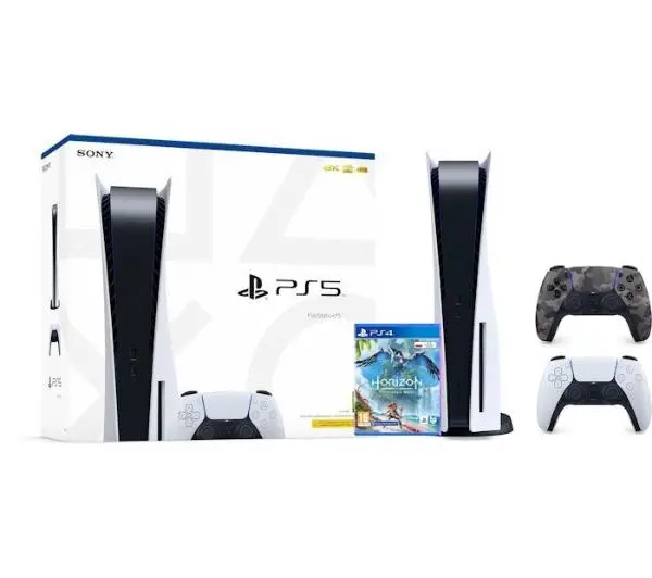 <h2>Sony PlayStation 5 (PS5) + Horizon Forbidden West + dodatkowy pad (kamuflaż)</h2>Poznaj nową jakość gier wideo z urządzeniem Sony PlayStation 5. Ciesz się niezrównaną jakością obrazu 8K i przestrzennym dźwiękiem, dzięki któremu jeszcze lepiej zorientujesz się w wydarzeniach z gry. Wraz z konsolą otrzymasz 2 pady DualSense oraz popularną grę Horizon Forbidden West.Wyjście obrazu 8K pozwala na uruchamianie gier w rozdzielczości do 4320p Wyświetlanie aż 120 klatek na sekundę przy częstotliwości odświeżania 120 HzPrzestrzenny dźwięk zapewnia lepszą kontrolę nad sytuacją w grzeBezprzewodowy kontroler DualSense pobudzi Twój zmysł dotyku podczas grySzybkie uruchamianie konsoli i gier dzięki dyskowi SSD o pojemności 825 GBDodatkowy pad w szarym kamuflażu pozwala na grę we dwoje Wraz z konsolą otrzymasz osadzoną w postapokaliptycznym świecie grę Horizon Forbidden West<h2>Poznaj konsolę do gier Sony PlayStation 5</h2> Niesamowite wrażeniaKonsola do gier Sony PlayStation 5 zabierze Cię na zupełnie nowy poziom wirtualnej rozgrywki. Urządzenie obsługuje bowiem wyjście obrazu 8K, dzięki czemu możliwe jest osiąganie zachwycającej jakości wyświetlanych grafik. Wszystko stanie się jeszcze bardziej realistyczne niż dotychczas – każdy cień czy promień słońca zostaną wiernie odwzorowane, a Ty będziesz mieć wrażenie, że oglądasz rzeczywiste lokalizacje i postaci. Wyjątkowo płynne scenyZapomnij o mikrozacięciach i spowolnieniach, które mogą zniszczyć całą radość z wirtualnej rozgrywki. Sony PlayStation 5 zapewnia wyświetlanie nawet 120 klatek na sekundę przy odświeżaniu na poziomie 120Hz! Dzięki temu obraz jest doskonale płynny, a jeśli Twój telewizor obsługuje formaty HDR, możesz cieszyć się także niebywałym bogactwem i żywiołowością kolorów. Wsłuchaj się w otoczeniePodczas emocjonujących rozgrywek niezwykłą rolę odgrywają dźwięki z wirtualnego świata. Sony PlayStation 5 dba o to, by były one dla Ciebie idealnie słyszalne zarówno wtedy, gdy odtwarzasz je na słuchawkach, jak i z głośników telewizora. Przestrzenne brzmienie otoczy Cię, dlatego będziesz dokładnie słyszeć, skąd dobiegają strzały i wybuchy oraz z której strony skradają się wrogowie. Interaktywny kontroler bezprzewodowyDzięki dołączonemu do urządzenia Sony PlayStation 5 bezprzewodowemu kontrolerowi DualSense poczujesz się jeszcze mocniej związany z wydarzeniami w grze. Ten wyjątkowy pad oferuje bowiem szeroką gamę efektów dotykowych „Trigger”. Poczujesz na przyciskach dynamiczny opór dopasowujący się do przedmiotów używanych w grze! Oszczędzaj czasNie musisz czekać długich minut, zanim Twoja ulubiona gra się uruchomi. Sony PlayStation 5 został wyposażony w szybki dysk SSD, za sprawą którego sama konsola, jak i wszystkie zainstalowane na nim tytuły włączają się w mgnieniu oka. Co więcej, dysk ma pojemność 825 GB, co pozwala na swobodne przechowywanie na nim wielu gier. Dodatkowy pad w zestawieOprócz urządzenia Sony PlayStation 5 i standardowego kontrolera DualSense, otrzymasz także drugi, dodatkowy pad. Dzięki niemu możesz zasiąść do rozgrywki ze swoją drugą połówką, pociechą lub przyjacielem, by razem przeżywać radość z wirtualnej zabawy. Dodatkowy kontroler ma specjalny design – ma szary kolor oraz wzór moro. W związku z tym dodaje niepowtarzalnego klimatu podczas gier wojennych! Gra Horizon Forbidden West Wraz z konsolą do gier Sony PlayStation 5 otrzymasz także bijącą rekordy popularności grę Horizon Forbidden West. Twoim zadaniem będzie ocalenie świata i ludzkości przed kolejną zagładą. Postapokaliptyczne otoczenie postawi jednak przed Tobą wiele wyzwań, a potężne maszyny będą stawały Ci na drodze do sukcesu. Taki dodatek do konsoli pozwoli Ci od razu po zainstalowaniu sprzętu odkryć jego wszystkie możliwości i dać się porwać pierwszej przygodzie.<h2>Zawartość opakowania Sony PlayStation 5</h2>W opakowaniu Konsola do gier Pad DualSense (2 szt.) Gra Horizon Forbidden West Kabel HDMI Kabel USB Kabel zasilający Podstawka Instrukcja obsługi w języku polskimSony – marka godna zaufaniaMiędzynarodowy zasięgGlobalna marka z japońskimi korzeniami Topowy producentJeden z największych producentów elektroniki użytkowej na świecie Wieloletnie doświadczenieInnowacyjne technologie tworzone od 1946 roku