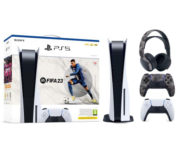 Konsola Sony PlayStation 5 (PS5) z napędem + słuchawki PULSE 3D (szary kamuflaż) + dodatkowy pad (szary kamuflaż) + FIFA 23