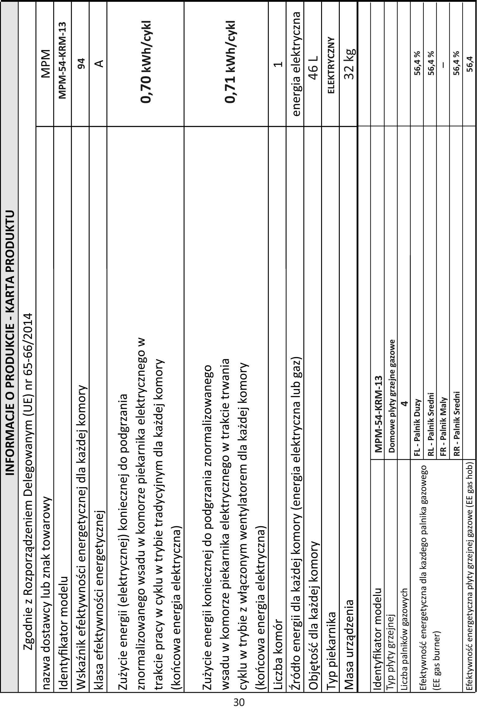Ulubione smaki w retro kuchniKuchnia gazowo‑elektryczna Retro Design MPM‑54‑KRM‑14Ulubione smaki w retro kuchniKuchnia gazowo‑elektryczna Retro Design MPM‑54‑KRM‑14Płyta gazowa Płyta gazowa<p>4 palniki gazowe z funkcją stabilizacji płomienia.</p>Multifunkcyjny piekarnik elektryczny Multifunkcyjny piekarnik elektryczny<p>Perfekcyjne wypieki za każdym razem.</p>Termoregulator Termoregulator<p>Pozwala ustawić i kontrolować temperaturę pieczenia.</p>Retro design Retro design<p>Modny akcent w kuchennej przestrzeni.</p>My Perfect Moment:My Perfect Moment:Kiedy kuchnia łączy w sobie styl, wygodę i wszechstronnośćKuchnia gazowo‑elektryczna MPM‑54‑KRM‑14 łączy retro design z nowoczesną funkcjonalnością. Beżowy kolor i stylizowane detale nadają wnętrzu elegancki charakter. Płyta gazowa z czterema palnikami o różnych wielkościach zapewnia precyzyjne gotowanie, a żeliwne ruszty gwarantują stabilność. Piekarnik elektryczny oferuje 6 trybów pieczenia, pozwalając na przygotowanie różnorodnych dań. Stylowe pokrętła i łatwa do czyszczenia powierzchnia to wygoda każdego dnia.Kuchnia gazowo‑elektryczna Retro Design MPM‑54‑KRM‑14Płyta gazowa pełen komfort gotowania<p>Płyta gazowa MPM-54-KRM-14 to połączenie funkcjonalności i elegancji w Twojej kuchni. Cztery palniki ze stabilizacją płomienia zapewniają precyzyjne gotowanie, a zabezpieczenia przeciwwypływowe dbają o bezpieczeństwo użytkowania. Wbudowana zapalarka iskrowa w pokrętłach gwarantuje wygodę, a dwuczęściowy ruszt żeliwny to trwałość i łatwe czyszczenie.</p>Multifunkcyjny piekarnik elektryczny Idealne wypieki<p>Kuchnia MPM-54-KRM-14 została wyposażona w multifunkcyjny piekarnik, który sprosta wymaganiom każdego miłośnika gotowania. Oferuje 6 trybów pieczenia, w tym opcję z termoobiegiem, gwarantującą równomiernie wypieczone i złociste potrawy. Wbudowane oświetlenie zapewnia doskonałą widoczność wnętrza, ułatwiając kontrolę nad pieczeniem, a przy tym tworzy przyjemny klimat w kuchni.</p>Termoregulator Precyzyjne pieczenie<p>Idealnie dopieczone potrawy na wyciągnięcie ręki! Nowoczesny termoregulator precyzyjnie utrzymuje wybraną temperaturę, a inteligentne czujniki dbają o jej stabilność. Otwierasz piekarnik w trakcie pieczenia? Urządzenie automatycznie wyrównuje straty ciepła, zapewniając perfekcyjne efekty. Puszyste ciasta, soczyste pieczenie – z tym piekarnikiem zawsze osiągniesz doskonały rezultat!</p>Retro design stylowe wykończenie kuchni<p>Wprowadź do swojej kuchni wyjątkowy klimat retro z kuchnią gazowo-elektryczną MPM-54-KRM-14! Beżowy odcień, stylowe detale w kolorze starego złota i klasyczne wykończenie łączą urok vintage z nowoczesną funkcjonalnością. To urządzenie z charakterem, które nada wnętrzu elegancji, a jednocześnie zapewni niezawodność i wygodę na co dzień.</p>Przytrzymaj palec na ikonie funkcji, aby poznać jej opis.Klasa energetyczna A<p>Energooszczędna klasa A dla większej wydajności i oszczędności.</p>Emaliowany front<p>Unikalny design i wygoda czyszczenia.</p>Moc<p>Urządzenie o mocy 1,85 kW.</p>Wymiary urządzenia<p>Wymiary urządzenia: wysokość 85 cm, szerokość 50 cm, głębokość 60 cm.</p>Metalowa pokrywa kuchni<p>Zabezpieczenie palników i płyty lub dodatkowa powierzchnia do pracy.</p>Pojemność piekarnika<p>Pojemność piekarnika to 58 l.</p>Wyposażenie<p>Kuchnia wyposażona jest w metalową pokrywę, żeliwny ruszt, siatkę, blachę do pieczenia oraz zestaw do gazu płynnego, w tym dysze i końcówkę.</p> Klasa energetyczna A<p>Energooszczędna klasa A dla większej wydajności i oszczędności.</p> Emaliowany front<p>Unikalny design i wygoda czyszczenia.</p> Moc<p>Urządzenie o mocy 1,85 kW.</p> Wymiary urządzenia<p>Wymiary urządzenia: wysokość 85 cm, szerokość 50 cm, głębokość 60 cm.</p> Metalowa pokrywa kuchni<p>Zabezpieczenie palników i płyty lub dodatkowa powierzchnia do pracy.</p> Pojemność piekarnika<p>Pojemność piekarnika to 58 l.</p> Wyposażenie<p>Kuchnia wyposażona jest w metalową pokrywę, żeliwny ruszt, siatkę, blachę do pieczenia oraz zestaw do gazu płynnego, w tym dysze i końcówkę.</p>WŁASNY SERWIS<p>To, co nas charakteryzuje, to własny park serwisowy, gdzie specjaliści serwisują tylko sprzęt naszej marki. Ponadto zapewniamy 10 lat naprawialności dla większości naszych produktów. Oznacza to wydłużony okres wsparcia serwisowego oraz dostępność części wymiennych i akcesoriów.</p>POLSKA MARKA<p>Zapewniamy polskim domom inteligentny, wydajny i kompleksowy sprzęt już od ponad 30 lat. Doskonale znamy rozwiązania, które wspierają codzienne obowiązki z dbałością o środowisko i budżet naszych klientów.</p> Chcesz wiedzieć więcej? Sprawdź nasze social media*Firma MPM jest w trakcie rebrandingu, zdjęcia prezentowane w karcie są poglądowe i mogą różnić się logotypem. <p>DUŻE AGD WOLNOSTOJĄCE</p> <p>DUŻE AGD ZABUDOWA</p> <p>MAŁE AGD KUCHNIA</p> <p>MAŁE AGD DOM</p> <p>URODA I PIELĘGNACJA</p> <p>WYPOSAŻENIE KUCHNI</p>