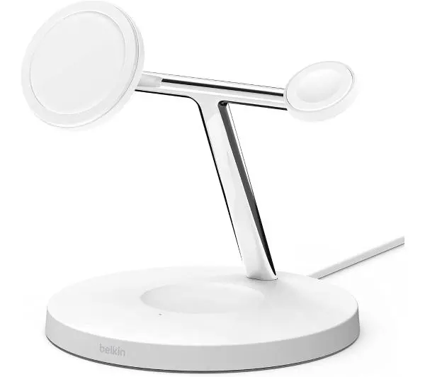 <h2>Belkin BoostCharge Pro 3-in-1 Wireless Charger MagSafe 15W (biały) </h2>Belkin BoostCharge Pro 3-in-1 Wireless Charger MagSafe 15Wto idealny dodatek dla wszystkich miłośników urządzeń marki Apple. Jest to ładowarka indukcyjna, na której zostały przygotowane stanowiska do bezprzewodowego zasilania 3 sprzętów mobilnych – telefonu, słuchawek oraz zegarka. Dzięki eleganckiemu designowi produkt świetnie zaprezentuje się w nowoczesnym biurze lub w stylowym salonie.Telefon, słuchawki i zegarek ładowane jednocześnieW pełni bezprzewodowe i bezpieczne zasilanie zapewnia technologia MagSafeŁadowanie w pionie lub poziomie pozwala na wygodne korzystanie z telefonu podczas zasilaniaLedowa dioda upewni Cię o prawidłowym ułożeniu słuchawek na ładowarceTechnologia szybkiego ładowania dla 3 urządzeń jednocześnieKompatybilność z pokrowcami MagSafe zapewnia większą swobodę zasilaniaŁadowanie zegarka Apple Watch w dowolnej pozycjiElegancki design sprawia, że ładowarka stanie się efektownym dodatkiem do biura czy salonu<h2>Poznaj ładowarkę indukcyjną Belkin BoostCharge Pro 3-in-1 Wireless Charger MagSafe 15W</h2> Ładowanie 3 urządzeń jednocześnieŁadowarka indukcyjna Belkin BoostCharge Pro 3-in-1 Wireless Charger MagSafe 15Wzostała wyposażona w 3 stanowiska do ładowania. W związku z tym za pomocą jednego urządzenia możesz zasilać jednocześnie swojego iPhone’a, słuchawki AirPods oraz zegarek Apple Watch. Tym samym unikniesz konieczności podłączania kolejnych ładowarek do gniazdek – wszystkie niezbędne sprzęty będą zawsze pod ręką! Technologia MagSafeNa co dzień korzystasz z urządzeń mobilnych marki Apple? W takim razie dobierz do nich urządzenie Belkin BoostCharge Pro 3-in-1 Wireless Charger MagSafe 15W! Jest to bowiem ładowarka współpracująca z technologią MagSafe dostępną w produktach z logiem nadgryzionego jabłka! Dzięki niej przymocujesz np. iPhone’a do ładowarki przy pomocy magnesu – szybko, wygodnie i bezpiecznie. Dowolne ustawienie telefonuChcesz korzystać z iPhone’a w trakcie jego ładowania? Urządzenie Belkin BoostCharge Pro 3-in-1 Wireless Charger MagSafe 15Wdaje Ci taką możliwość. Telefon możesz przymocować do ładowarki w orientacji pionowej lub poziomej technologią MagSafe – w zależności od tego, czy chcesz scrollować Social Media lub strony www, czy też chcesz wygodnie obejrzeć kolejny odcinek ulubionego serialu. Kontrola ładowania słuchawekZdarza Ci się niechlujnie rzucić słuchawki w etui na ładowarkę, przez co nie zawsze zostają one prawidłowo podłączone do zasilania? Z Belkinem BoostCharge Pro 3-in-1 Wireless Charger MagSafe 15Włatwiej unikniesz podobnych sytuacji! Wystarczy, że rzucisz okiem na diodę na urządzeniu i upewnisz się, czy słuchawki są w trakcie ładowania – zyskasz pewność, że niedługo będą w pełni gotowe do dalszego użytkowania. Pasuje do różnych wnętrzŁadowarka indukcyjna Belkin BoostCharge Pro 3-in-1 Wireless Charger MagSafe 15Wto nie tylko praktyczny sprzęt używany każdego dnia. To również niezwykły dodatek do Twoich wnętrz, który nada im elegancki charakter. Świetnie zaprezentuje się ustawiony na blacie biurka w gabinecie lub też dopełni wystroju starannie zaaranżowanego salonu. Szybkie ładowanieMasz mało czasu do wyjścia z domu, a chcesz naładować wszystkie swoje urządzenia mobilne? Belkin BoostCharge Pro 3-in-1 Wireless Charger MagSafe 15Wświetnie sprawdzi się w podobnej sytuacji! Ładowarka pozwala korzystać z funkcji szybkiego ładowania na wszystkich 3 urządzeniach w tym samym czasie, a więc już po kilkudziesięciu minutach zyskasz energię potrzebną do używania zegarka, słuchawek i telefonu! Współpraca z pokrowcami MagSafeJeśli chcesz, by ładowanie urządzeń mobilnych było jeszcze prostsze, postaw na Belkin BoostCharge Pro 3-in-1 Wireless Charger MagSafe 15W. W przypadku tej ładowarki nie musisz wyjmować telefonu czy słuchawek z pokrowców, ponieważ produkt współpracuje także ze wszystkimi oficjalnymi etui MagSafe. Wobec tego możesz błyskawicznie podłączać urządzenia do ładowania i w mgnieniu oka zabierać je z ładowarki w pełni gotowe do użytku. Zasilanie zegarka AppleKorzystając z modelu Belkin BoostCharge Pro 3-in-1 Wireless Charger MagSafe 15W, możesz ładować zegarek Apple Watch na 2 sposoby. Połóż go na płasko na ładowarce lub ustaw na specjalnym stanowisku tak, by używać go w trybie stolika nocnego. Wówczas możesz korzystać z niego jak z praktycznego budzika w trakcie nocy. Na wyświetlaczu pojawi się informacja o godzinie, dacie, a także o nadchodzących alarmach. Nowoczesne wzornictwoLubisz gadżety w nowoczesnym stylu? Ładowarka indukcyjna Belkin 3-in-1 MagSafe spełni Twoje oczekiwania. Forma urządzenia jest minimalistyczna, dzięki czemu świetnie wpisuje się w aktualne trendy wnętrzarskie. Składa się z okrągłej podstawy oraz rozgałęziającego się na 2 części korpusu. Wszystko to w połączeniu z prostą kolorystyką tworzy dodatek o uniwersalnym charakterze.<h2>Zawartość opakowania Belkin BoostCharge Pro 3-in-1 Wireless Charger MagSafe 15W</h2>W opakowaniu Ładowarka indukcyjna Zasilacz sieciowyBelkin – marka godna zaufaniaZnana i lubiana marka Amerykański producent akcesoriów komputerowych o międzynarodowym zasięguWieloletnie doświadczenie Firma obecna na rynku od 1983 rokuProdukty doceniane przez konsumentówInnowacyjne technologie ładowania oraz ochrony urządzeń