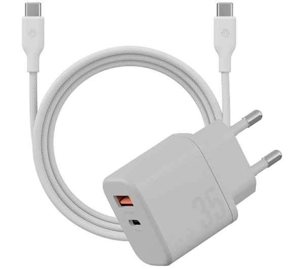Ładowarka sieciowa Energea Bazic Goport Velox Kit 1xUSB-C 1xUSB-A GaN 35W z kablem plecionym Biały