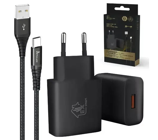 <h2>Kompleksowe rozwiązanie do ładowania i synchronizacji danych</h2><p>Odkryj wygodę i funkcjonalność zestawu Extralink Smart Life Cable + Charger, który pozwala ładować i synchronizować dane Twoich urządzeń mobilnych z niezrównaną wydajnością.</p><h2>Kabel USB Type-A do Type-C o długości 200 cm</h2><p>Szybkie ładowanie i transfer danych - kabel USB Type-A do Type-C gwarantuje ekspresowe ładowanie oraz bezpieczny transfer informacji. Dzięki rozciągnięciu na 200 cm, masz więcej swobody w użytkowaniu i obsłudze urządzeń.</p><h2>Ładowarka 12W</h2><p>Niewielkich rozmiarów, ale mocna - ładowarka 12W jest idealnym towarzyszem podróży i codziennego użytkowania. Zapewnia szybkie i bezpieczne ładowanie Twoich urządzeń, dzięki czemu możesz zawsze być podłączony.</p><h2>Solidna konstrukcja i elegancki design</h2><p>Stylowy i funkcjonalny - zestaw jest wykonany z wysokiej jakości materiałów, a kolor Czary/Szary doskonale komponuje się z każdym otoczeniem, od biura po domowe wnętrze.</p><h2>Wykorzystanie w praktyce</h2><p>Wyjątkowo przydatny w życiu codziennym - Extralink Smart Life Cable + Charger stanowi niezbędne wyposażenie dla jednostek, które klasyfikują wysoko jakość oraz niezawodność. Perfekcyjnie nadaje się do ładowania smartfonów, tabletów, czytników e-booków oraz innych urządzeń wyposażonych w port USB-C.</p><h2>Specyfikacja</h2><ul> <li> Typ wejścia ładowarki: USB-A </li> <li> Typ wejścia kabla: : USB-A </li> <li> Typ wyjścia kabla: : USB-C </li> <li> Całkowita moc wyjściowa kabla: : 15W </li> <li> Całkowita moc ładowarki: : 12W </li></ul>