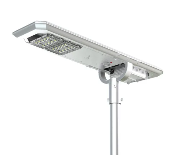<h2>Solarna lampa uliczna ATLAS 4000 lm (lumen) SSL34 – wydajne i niezależne oświetlenie LED (Light Emitting Diode)</h2><p>Solarna lampa uliczna ATLAS SSL34 to nowoczesny, niezależny system oświetlenia zasilany energią słoneczną, zaprojektowany z myślą o maksymalnej swobodzie projektowania małej architektury. Dzięki technologii All-in-One wszystkie kluczowe elementy – panel solarny, źródło światła LED oraz bateria – zostały zintegrowane w jednej, solidnej konstrukcji. Wydajny panel solarny ładuje wbudowany akumulator w ciągu dnia, a lampa uruchamia się automatycznie po zmierzchu, zapewniając bezpieczne i ekologiczne oświetlenie bez konieczności podłączania do sieci energetycznej.</p><h3>Wysoka skuteczność świetlna i bezpieczeństwo pracy</h3><p>Lampa ATLAS została wyposażona w 40 diod SSC LED o skuteczności do 190 lm/W (wat), zapewniających jasne, równomierne światło o rozprowadzeniu pod kątem 140°. System zabezpieczeń obejmuje ochronę przed przeładowaniem, głębokim rozładowaniem oraz zwarciem, gwarantując bezpieczną i stabilną eksploatację w każdych warunkach. Diody LED mają żywotność do 50 000 godzin, a panel solarny minimum 10 lat.</p><h3>Inteligentny system i oszczędność energii</h3><p>ATLAS SSL34 posiada wbudowany czujnik ruchu o zasięgu do 8 m (metr) i czujnik zmierzchowy. Dzięki zaawansowanym technologiom ALS2.3 (Adaptive Lighting System), VFT (Variable Frequency Technology) i TCS (Temperature Control System) praca lampy jest wydajna nawet w pochmurne lub deszczowe dni.</p><h3>Dane techniczne</h3><ul> <li>Źródło światła: LED x40, moc 40W, 5700K (kelwin) (biały zimny)</li> <li>Współczynnik CRI (Color Rendering Index): Ra (Rendering Average)>70</li> <li>Kąt oświetlenia: 140°</li> <li>Panel słoneczny: 38,4 W, wymiary 827x241 mm (milimetr)</li> <li>Bateria: Li-Ion (litowo-jonowa) 269,36 Wh(watogodzina)</li> <li>Czas ładowania: 7 godzin bezpośrednio ze światła słonecznego</li> <li>Czas świecenia po pełnym naładowaniu: do 10 nocy</li> <li>Czujnik ruchu: zasięg do 8 m</li> <li>Czujnik zmierzchowy: włącza się ≤10 Lux, wyłącza ≥50 Lux</li> <li>Zakres temperatury pracy: ładowanie 0-45°C, świecenie -20-60°C</li> <li>Klasa ochrony: IP65 (Ingress Protection), wytrzymałość mechaniczna IK10 (Impact Protection)</li> <li>Montaż: słup o średnicy 60 mm (brak w zestawie), zalecana wysokość 4 m, odległość 15 m</li> <li>Wymiary produktu: 963x303x84 mm, waga 9270g(gram)</li> <li>Wymiary opakowania: 1045x378x152 mm, waga 10510g</li> <li>Materiał: aluminium, szkło</li> <li>Kolor: srebrny</li> <li>Tryby pracy i wskaźnik baterii:</li> <li>Czerwona dioda (tryb M1) – moc 30% w trybie czuwania do świtu + 100% po wykryciu ruchu</li> <li>Zielona dioda (tryb M2) – moc 100% przez 5 h + moc 25% w trybie czuwania po zmierzchu i 100% przy wykryciu ruchu przez 5 h + moc 70% do brzasku</li> <li>Pomarańczowa dioda (tryb M3) – ciągła moc 70%</li> <li>Wskaźnik pojemności baterii:</li> <li>Zielone światło – powyżej 70%</li> <li>Pomarańczowe światło – 30-70%</li> <li>Czerwone światło – 10-30%</li> <li>Czerwone migające światło – poniżej 10%</li></ul><h3>Zestaw zawiera</h3><ul> <li>Lampa solarna ATLAS SSL34</li> <li>Śruby montażowe</li> <li>Skrócona instrukcja obsługi (w języku angielskim)</li> <li>Prosimy pamiętać, że podane czasy ładowania przez panel fotowoltaiczny dotyczą idealnych warunków promieniowania w naszej szerokości geograficznej. Odchylenie kąta padania promieni słonecznych oraz częściowe zacienienie może znacząco wydłużyć czas ładowania.</li></ul>
