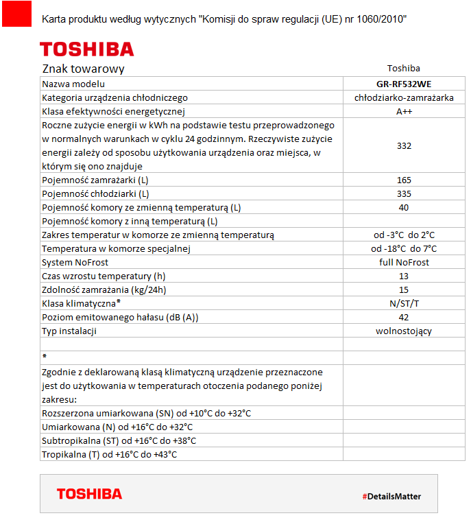 <p>TOSHIBA GR-RF532WE</p><h3>Lodówka French Door Toshiba</h3><ul> <li> <h4>Pojemność 500 l (chłodziarka:335 l, zamrażalnik:165 l)</h4> <p> </p> </li> <li> <h4>wys 1898mm x szer 833mm x gł 685mm</h4> <p> </p> </li> <li> <h4>klasa A++</h4> <p> </p> </li> <li> <h4>kolor: morandi grey</h4> <p> </p> </li> <li> <h4>Lodówka No Frost</h4> <p> </p> </li></ul> <h2>Chłodziarko zamrażarka Toshiba GR-RF532WE</h2><h4>Dual Inverter</h4><p>Ciesz się efektywną pracą lodówki i jednocześnie obniż rachunki za prąd! Dzięki technologii Dual Inwerter zużywasz nawet o 20% energii. A dodatkowo masz gwarancję cichej i długiej pracy urządzenia.</p><h4>Dual radar sensor</h4><p>Równomierne schłodzenie lodówki o tak dużej pojemności to nie lada wyzwanie. Ale nasz czujnik automatycznie wyłapuje wewnętrzne różnice temperatur i je reguluje – bez Twojego udziału.</p><h4>1+3 mode</h4><p>Lodówka modułowa? Oczywiście! Dzięki systemowi 1+3 Mode możesz wybrać, jaką funkcję będą pełniły poszczególne części Twojej lodówki – mogą być lodówką, zamrażarką lub pozostać wyłączone.</p><h4>18 przegródek</h4><p>532 l pojemności cieszą i… przerażają. Jak zachować porządek w tak pojemnej lodówce? Po prostu korzystaj z 18 specjalnie wydzielonych stref, które pomogą Ci w pełni korzystać z całej przestrzeni. Na wszystko znajdzie się odpowiednie miejsce.</p> <h2>Zastosowane technologie</h2><p>3 Cycle</p><p>Dzięki dwóm niezależnym systemom chłodzenia i trzem niezależnym cyrkulacjom powietrza Twoje jedzenie jest zawsze idealnie schłodzone i świeże!</p><p>Humidity Control</p><p>Jak wiesz, zimne powietrze wysusza, a to nie sprzyja np. warzywom i owocom. Dlatego w szufladach jest osobno regulowana wilgotność – tak, abyś dłużej cieszył się pysznym jedzeniem.</p><p>Plasma Pure</p><p>Działanie antybakteryjne w Twojej lodówce! System wytwarza jony i elektrony. Ich działanie zabija bakterie, neutralizuje zapachy i oczyszczają powietrze. Dzięki temu jedzenie dłużej jest w nienaruszonym stanie.</p> <h2>Funcje lodówki GR-RF532WE</h2><h3>3 CYCLE & Dual cooling</h3><p> </p><p>Idealne schłodzenie i pełna kontrola nad brzydkimi zapachami – właśnie to zyskujesz z naszą lodówką. Niezależnie od tego, co akurat przechowujesz w lodówce, ważne jest, żeby panowała w niej odpowiednia, stabilna temperatura. Gwarantują Ci to 3 niezależne cyrkulacje powietrza. A dodatkowe 2 niezależne systemy chłodzenia odpowiadają za usunięcie brzydkich zapachów, zwiększenie efektywności chłodzenia i utrzymanie wysokiej retencji wilgoci!</p><h3>Dual Inverter</h3><p> </p><p>Podwójna moc ma znaczenie! Dlatego połączyliśmy wentylator ze sprężarką. Zapewnia to stabilną pracę Twojej lodówki oraz optymalne chłodzenie. Dodatkowo silnik inwerterowy – poza trwałością – gwarantuje cichą pracę i pozwala oszczędzić nawet 20% energii. To wszystko z kolei przekłada się na dłuższy czas użytkowania urządzenia, bez awarii i bez problemów.</p><h3>Dual RADAR SENSORS</h3><p> </p><p>Zdarza Ci się włożyć do lodówki jeszcze lekko ciepłe danie? Między innymi właśnie na takie okazje w lodówkach Toshiba jest zainstalowany system Dual Radar Sensors. Czujniki automatycznie rozpoznają różnice temperatur wewnątrz urządzenia i dostosowują działanie do zmiany warunków. Dzięki temu w Twojej lodówce zawsze panuje stabilna i optymalna temperatura.</p><h3>40l komora z regulowaną temperaturą</h3><p> </p><p>Trzy stopnie zmiany temperatury: miękkie zamrażanie, zero stopni, owoce i warzywa. Można dokładnie regulować temperaturę w zakresie od - 2 ℃ do 3 ℃ wedle potrzeb</p><h3>Humidity Control</h3><p> </p><p>Koniec w wysuszonymi i niesmacznymi warzywami oraz owocami. Teraz możesz wybierać między 3 poziomami wilgotności w specjalnej szufladzie (wysoka, średnia i niska). Każda żywność wymaga innych warunków przechowywania i chłodzenia, a Ty możesz to ustawiać indywidualnie w zależności od aktualnej zawartości Twojej lodówki.</p><h3>Plasma Pure</h3><p> </p><p>Zdarza się, że pewne produkty leżą w lodówce nieco dłużej niż powinny. Takie warunki sprzyjają pojawianiu się bakterii czy brzydkich zapachów. Ale nie z technologią Plasma Pure! Jej działanie jest bardzo proste i polega na wytwarzaniu jonów dodatnich oraz ujemnych, które zabijają wspomniane bakterie, neutralizują zapachy i regularnie oczyszczają schłodzone powietrze. To gwarancja dłuższej świeżości przechowywanych w lodówce produktów.</p><h3>1+3 mode</h3><p> </p><p>Jak zwykle przed urlopem opróżniasz lodówkę, żeby nic się nie zmarnowało. Ale co z zamrażalnikiem? Czy naprawdę musisz zostawić włączone całe urządzenie? Oczywiście, że nie! Z lodówką Toshiba samodzielnie regulujesz sposób jej działania. Na przykład wszystkie dostępne komory lodówki mogą działać jak lodówka albo tradycyjnie z dolnej części możesz zrobić zamrażalnik. Albo – na przykład na czas wyjazdu – możesz wyłączyć część chłodzącą, a zostawić jedynie pracujący zamrażalnik. Dbanie o oszczędzanie i środowisko jest bardzo proste!</p><h3>Alloy Cooling™</h3><p> </p><p>Wiemy, że dla żywności przechowywanej w lodówce temperatura ma znaczenie. A przede wszystkim system schładzania ma znaczenie. Szybkie i stabilne obniżanie temperatury niesie za sobą wiele korzyści, dlatego jest tak ważne. Właśnie dlatego w lodówce Toshiba jest system chłodzenia 360°, który w krótszym czasie obniża temperaturę i jednocześnie równomiernie chodzi całą komorę.</p><h3>Szuflady na prowadnicach</h3><p> </p><p>Szuflady, które są wygodne w użyciu i nie wypadają, gdy wysuniesz je zbyt mocno? Te na prowadnicach właśnie tak działają i otwierają się zawsze w 100%. Zyskujesz w ten sposób łatwy dostęp do żywności. Szuflady na prowadnicach są też dość solidną konstrukcją, która wytrzyma nacisk nawet 55 kg!</p> <p>Środkowa szufl
