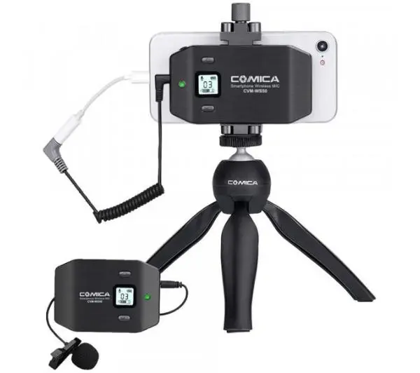 w zestawie:Odbiornik ze zintegrowanym uchwytem do telefonu Nadajnik typu bodypack Mikrofon krawatowy Statyw Kabel męski TRS 3,5 mm na męski TRRS 3,5 mm Kabel do ładowania Micro-USB Zaczep do paska Piankowa osłona mikrofonu Osłona przeciwwietrzna ze sztucznego futra Pokrowiec