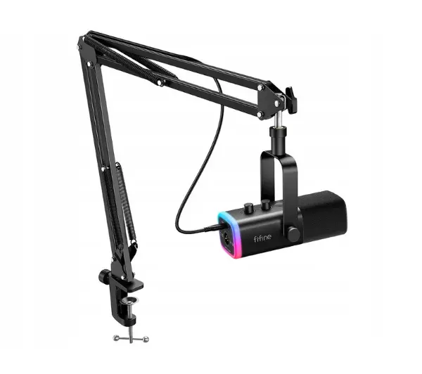 <h2>Fifine AmpliGame AM8T Czarny</h2>Co wyróżnia mikrofon Fifine AmpliGame AM8T? Studyjna jakość dźwięku, prosta obsługa, efektowne podświetlenie i możliwość kontrolowania brzmienia w czasie rzeczywistym. Można go wykorzystać do streamingów, podcastów i nagrań – zarówno w studio, jak i w domowych warunkach.Niezawodność i jakość dźwięku dzięki odpowiedniej konstrukcji wkładu mikrofonowegoKardioidalna charakterystyka promieniowania zapewnia czysty i wyraźny dźwiękEfektowne podświetlenie umożliwia stworzenie dogodnej atmosfery do gryMonitorowanie dźwięku w czasie rzeczywistym z wyjściem słuchawkowym 3,5 mm do odsłuchu bez opóźnieńŁatwe podłączenie za pomocą dwóch różnych złączy – do użytku domowego i profesjonalnego<h2>Poznaj mikrofon Fifine AmpliGame AM8T</h2> Wysoka jakość dźwiękuMikrofon Fifine AmpliGame AM8T pozwala uzyskać krystalicznie czyste, stabilne brzmienie zarówno w profesjonalnym studiu nagraniowym, jak i w domowych warunkach. Za precyzyjne odwzorowanie głosu odpowiada wkład mikrofonowy, w którym cewka i membrana skutecznie przekształca fale akustyczne w sygnał elektryczny. Takie rozwiązanie minimalizuje straty jakości i redukuje zniekształcenia. Redukcja dźwięków otoczeniaZastosowana w urządzeniu Fifine AmpliGame AM8T charakterystyka kardioidalna (jednokierunkowa) przechwytuje dźwięk przede wszystkim z przodu kapsuły, jednocześnie tłumiąc dźwięki dochodzące z innych kierunków. W praktyce odrzuca hałasy pomieszczenia, dzięki czemu głos brzmi czyściej i jest odczytywany z mniejszą ilością pogłosu. Efektowne podświetlenieZintegrowane podświetlenie RGB (Red-Green-Blue) w Fifine AmpliGame AM8T nadaje stanowisku gamingowemu nowoczesny wygląd i pozwala dopasować barwy do reszty setupu. Dzięki trzem trybom podświetlenia stworzysz klimat pasujący do chwili – od pracy po zabawę, zawsze z unikalnym efektem. Monitorowanie dźwiękuNa obudowie mikrofonu znajdziesz wyjście słuchawkowe 3,5 mm do odsłuchu bez opóźnień oraz regulator głośności. Słyszysz dokładnie to, co rejestruje kapsuła – możesz więc od razu skorygować odległość od mikrofonu i głośność mówienia zanim nagranie trafi do słuchaczy. Dodatkowe udogodnienia W zestawie z Fifine AmpliGame AM8T otrzymujesz ramię typu pantograf z możliwością obrotu w pionie i w poziomie, które umożliwia precyzyjne ustawienie mikrofonu tuż przy ustach. Mikrofon posiada również zintegrowany schowek na kable, bo pozwala na ich zagospodarowanie. Przełączniki na obudowieMikrofon Fifine AmpliGame AM8T wyposażony jest w intuicyjny zestaw przełączników i pokręteł, które pozwalają szybko reagować na potrzeby w trakcie nagrania czy streamingu. Przełącznik czułości na korpusie pozwala dopasować sposób rejestrowania głosu, dbając o idealną równowagę między głośnością a jakością nagrania. Dotykowy przełącznik wyciszenia/włączenia dźwięku daje możliwość szybkiego wy mikrofonu, a regulator głośności słuchawek umożliwia wygodne monitorowanie poziomu dźwięku. Dodatkowo pokrętło RGB pozwala dopasować podświetlenie do nastroju. Łatwe podłączanieMożesz wykorzystać dwa sposoby podłączenia Fifine AmpliGame AM8T. Cyfrowe przez USB-C (Universal Serial Bus Type-C) do USB-A (Universal Serial Bus Type-A) umożliwia szybkie, podłączenie mikrofonu do komputera, laptopa czy konsoli, a technologia Plug&Play natychmiastowe korzystanie z mikrofonu – bez instalacji sterowników czy dodatkowej konfiguracji. Profesjonalne złącze audio XLR (External Line Return) pozwala wpiąć mikrofon do sprzętu studyjnego, jak miksery czy karty dźwiękowe, umożliwiając kontrolę nad dźwiękiem i jego obróbkę. <h2>Zawartość opakowania Fifine AmpliGame AM8T</h2>W opakowaniu Mikrofon Kabel USB (Universal Serial Bus) Statyw pantograf Adapter śrubowy 5/8″, 3/8″ Instrukcja obsługiFifine – marka godna zaufaniaDoświadczenie w branżyMarka działająca od 2009 roku w branży technologii dźwiękowej.Innowacje w nagrywaniu dźwiękuFirma wykorzystująca innowacyjne technologie w urządzeniach do nagrywania i przesyłania dźwięków. Dla amatorów i profesjonalistówProducent mikserów, słuchawek i mikrofonów dla zawodowców, amatorów gier online czy streamerów.