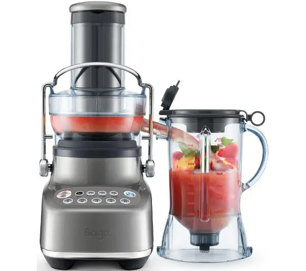 1.0 9312432035736 19_11_2024 Blender z funkcją sokowirówkithe 3X Bluicer™Sage SJB615Więcej smaku, większa różnorodność, więcej radości. Wydobądź to, co najlepsze ze świeżych składników dzięki 3X Bluicer™.Zaawansowany blender z funkcją sokowirówkiPosiada system ostrzy Kinetix®, idealnie dopasowany do kielicha, oraz szeroki otwór wsadowy o średnicy 88 mm. Dzięki technologii Cold Spin® możesz wycisnąć świeży sok bezpośrednio do dużego kielicha o pojemności 1,5 litra i tworzyć smaczne slushy, smoothie, koktajle i inne pyszne napoje.Blendowanie, wyciskanie soku, a może oba jednocześnie?Teraz nie musisz wybierać! Dzięki urządzeniu 3X Bluicer™ możesz blendować, wyciskać sok lub łączyć obie funkcje. Przygotowuj zdrowsze, pełne smaku smoothie, frappe, slushy, świeże koktajle i wiele innych, mieszając składniki z sokiem wyciśniętym na świeżo. Ciesz się maksymalną świeżością i zyskaj 3 razy więcej smaku, różnorodności i radości.Oszczędność miejscaJedna baza to więcej wolnej przestrzeni. Możesz blendować, wyciskać sok lub łączyć obie funkcje, korzystając z tej samej bazy. Dodatkowo pojemnik na miąższ w blenderze 3X Bluicer™ jest umieszczony z tyłu urządzenia, co nadaje mu bardziej kompaktowy kształt i pozwala lepiej wykorzystać miejsce na blacie.4 programy uruchamiane jednym dotknięciemProgramy obsługiwane jednym przyciskiem zapewniają optymalny czas i prędkość, gwarantując najsmaczniejsze efekty. Delektuj się kremowymi smoothie dzięki dedykowanym programom, zamieniaj lód w śnieg w trybie pulsacyjnym/kruszenia lodu, lub przygotowuj pyszne, świeże koktajle za pomocą programu do mrożonych napojów.System ostrzy Kinetix® dopasowanych do naczyniaKombinacja mocnego blendera z funkcjami robota kuchennego oferuje wszechstronność i wygodę użytkowania. Ostrza rozgniatają i siekają, aby zamienić lód w śnieg, mieszają i napowietrzają, tworząc kremowe smoothie oraz zupy.Kompatybilność z przystawką Vac Q™Sage 3X Bluicer™ jest przystosowany do współpracy z przystawką próżniową Vac Q™, która poprawia konsystencję i zachowuje intensywne kolory blendowanych składników. W przypadku niektórych przepisów odessanie powietrza wzmacnia smak, pozwala uzyskać gładsze zielone smoothie, bardziej kremowe pasty, delikatne dipy i aksamitne zupy gazpacho. Dla mlecznych shake'ów pęcherzyki powietrza wewnątrz napoju dodają lekkości i puszystości. Przystawkę Vac Q™ można zakupić oddzielnie.Technologia Cold Spin®Technologia Cold Spin® pozwala na przepływ soku przez stalową tarczę tnącą umieszczoną we włoskim filtrze siatkowym, co sprawia, że wzrost temperatury jest minimalny i nie przekracza 1°C.Ekstra szeroki otwór wsadowySage 3X Bluicer™, który został wyposażony w wyjątkowo szeroki otwór wsadowy o średnicy 88 mm, umożliwia wyciskanie soku z całych owoców i warzyw bez konieczności ich krojenia.Specyfikacja<ul> <li>Wymiary urządzenia (szer. x gł. x wys.): 397 x 236 x 450 mm</li> <li>Materiał: Obudowa z tworzywa ABS, ostrza ze stali nierdzewnej</li> <li>Dzbanek: 1,5 l</li> <li>Pojemnik na miąższ: 3 l</li> <li>Ustawienia prędkości: 5</li> <li>Moc: 1000 W</li> </ul>Funkcje<ul> <li>Przyrządzanie smoothie</li> <li>Pulse / Ice Crush</li> <li>Auto Clean (automatyczne czyszczenie)</li> <li>Frozen Cocktail (mrożony koktajl)</li> </ul>Akcesoria w zestawie<ul> <li>Szczotka do czyszczenia</li> <li>Dysza pozwalająca wyciskać sok prosto do szklanki</li> </ul>