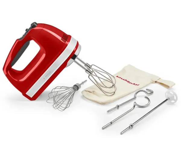 <h4>KitchenAid 5KHM9212EER (czerwony)</h4><p>Skuteczny 9-biegowy mikser ręczny KitchenAid z silnikiem prądu stałego, funkcją łagodnego startu i zestawem mieszadeł ze stali nierdzewnej.</p><h4>Poznaj mikser ręczny 9-biegowy KitchenAid 5KHM9212EER</h4><a></a><h5>SILNIK PRĄDU STAŁEGO</h5><p>Dzięki wydajnemu silnikowi prądu stałego i elektronicznemu czujnikowi mikser zapewnia doskonałą pracę przy każdej prędkości, niezależnie od tego, jak gęsta jest przetwarzana masa.</p><a></a><h5>STEROWANIE ELEKTRONICZNE</h5><p>Różne rodzaje ciasta potrzebują różnych prędkości miksowania. Dlatego mikser ręczny KitchenAid ma aż dziewięć biegów, które możesz zmieniać za pomocą precyzyjnego, elektronicznego panelu sterowania. Obawiasz się bałaganu na blacie? Funkcja łagodnego startu zapobiega pyleniu i rozchlapywaniu składników.</p><a></a><h5>STAL NIERDZEWNA</h5><p>Akcesoria do miksera KitchenAid mają wzmocnioną konstrukcję i są wykonane z wytrzymałej stali nierdzewnej. Dzięki temu mieszadła są trwałe, a po użyciu można je wygodnie umyć w zmywarce.</p><h4>Mikser ręczny 9-biegowy KitchenAid 5KHM9212EER z bliska</h4><h6>1 WYGODNY PANEL STEROWANIA Z WYŚWIETLACZEM LED</h6><p>Ergonomiczne przyciski i czytelny wyświetlacz z diodami LED pozwalają wygodnie zmienić prędkość obrotów miksera.</p><h6>2 WORECZEK NA WSZYSTKIE MIESZADŁA</h6><p>Trzymaj wszystkie akcesoria w jednym miejscu – do miksera ręcznego KitchenAid dołączony jest praktyczny bawełniany woreczek na mieszadła.</p><h6>3 HAKI DO GĘSTEGO CIASTA</h6><p>Wytrzymałe, solidne haki ze stali nierdzewnej doskonale poradzą sobie z wyrobieniem nawet bardzo gęstej masy.</p><h4>W opakowaniu KitchenAid 5KHM9212EER</h4><h6>1Mikser ręczny KitchenAid</h6><h6>22 trzepaczki 17 cm ze stali nierdzewnej</h6><h6>32 haki ze stali nierdzewnej</h6><h6>416-prętowa rózga do napowietrzania</h6><h6>5Nasadka miksująca do koktajli i sosów majonezowych</h6><h6>6Bawełniany pokrowiec na narzędzia</h6><h6>7Instrukcja obsługi w języku polskim</h6><h6>8Karta gwarancyjna</h6><h4>KitchenAid – marka godna zaufania</h4><p>Ponad 100 lat doświadczenia</p><p>Urządzenia kuchenne premium</p><p>Kultowy design</p>