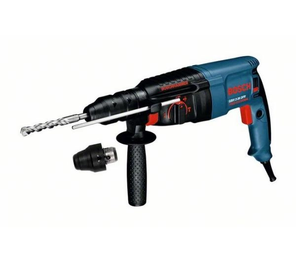 GBH 2-26 DFR ProfessionalSzybkie wszechstronne urządzenie do codziennych prac<ul> <li>Szybko wykonana praca dzięki dużej prędkości wiercenia i wysokiej wydajności dłutowania – urządzenie jest wyposażone w silnik 800 W, a energia udaru wynosi 2,7 J</li> <li>Wysokiej jakości komponenty gwarantują niezawodność, wytrzymałość oraz długą żywotność</li> <li>Szerokie spektrum zastosowań dzięki blokadzie udaru do prac związanych z dłutowaniem</li> <li>Wymienny uchwyt wiertarski umożliwia szybką wymianę osprzętu: np. wiertła SDS-plus na wiertła cylindryczne do wiercenia bez udaru w drewnie i metalu</li> <li>Tulejka kulkowa zapobiega zerwaniu kabla</li> <li>Obrotowy szczotkotrzymacz (taka sama moc przy obrotach w prawo i w lewo)</li> <li>Sprzęgło przeciążeniowe chroniące użytkownika i urządzenie</li> <li>Obroty w prawo/lewo umożliwiają wyjęcie zakleszczonego wiertła</li> <li>Płynna regulacja prędkości obrotowej umożliwia czyste nawiercanie</li> <li> </li> <li> </li></ul>Wyposażenie standardowe:<ul> <li>Ogranicznik głębokości 210 mm</li> <li>Rękojeść dodatkowa</li> <li>Szybkozaciskowy uchwyt wiertarski 13 mm</li> <li>Walizka narzędziowa</li> <li>Wymienny uchwyt wiertarski SDS-plus</li></ul>