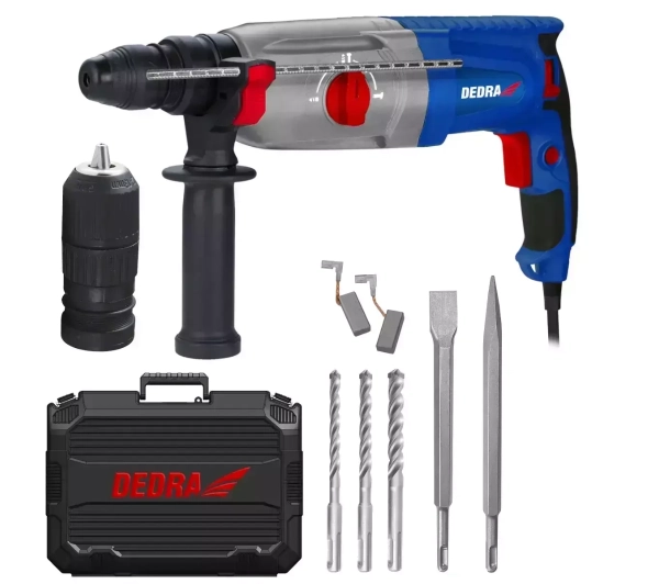 : dłuto, rękojeść dodatkowa, szczotki zapasowe, szpicak, uchwyt wiertarski samozaciskowy, walizka, wiertła