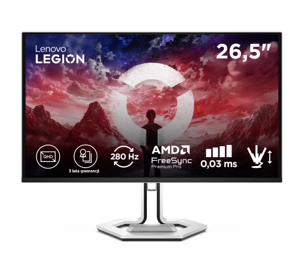 <h2>Stworzony dla wymagających graczy</h2>Wyposażony w technologię ekranu PureSight QD‑OLED (Quantum Dot Organic Light‑Emitting Diode) oraz wyjątkową klarowność obrazu dzięki rozdzielczości QHD (Quad High Definition), spełni oczekiwania graczy ceniących najwyższą jakość. Doświadcz superszybkiej wydajności i realizmu HDR (High Dynamic Range), które zapewniają głęboką immersję i przewagę konkurencyjną na każdej arenie. <h2>Wyjątkowo żywe wrażenia wizualne w grach</h2> 26,5‑calowy wyświetlacz QHD zapewnia krystalicznie czysty obraz, który uwydatnia każdy detal. Technologia PureSight QD‑OLED oferuje oszałamiającą jakość obrazu i zapierający dech w piersiach kontrast, ożywiając każdy wirtualny świat. Dzięki 99% pokryciu palet sRGB (standard Red, Green, Blue) i DCI‑P3 (Digital Cinema Initiatives ‑ Protocol 3), obsłudze 1,07 miliarda kolorów, prawdziwej 10‑bitowej głębi oraz fabrycznej kalibracji z dokładnością Delta E<2, otrzymujesz ultrarealistyczne, żywe kolory, dokładnie takie, jak zaplanowali twórcy gier.Doświadcz głębszego kontrastu, bogatszych detali i płynniejszych przejść tonalnych dzięki Dolby Vision® oraz VESA Certified DisplayHDR™ True Black 400 (Video Electronics Standards Association) ‑ to wizualna doskonałość, która zapewnia prawdziwie nową jakość immersji w grach. <h2>Płynna rozgrywka bez kompromisów</h2>Częstotliwość odświeżania 280 Hz daje Ci przewagę, pozwalając reagować natychmiast i celować z chirurgiczną precyzją, bo w decydujących momentach liczy się szybkość. Ekstremalnie szybki czas reakcji 0,03 ms eliminuje rozmycie ruchu. Pozostań skupiony dzięki ostrym jak brzytwa obrazom, niezależnie od intensywności akcji. Certyfikat ClearMR 15 000 jest gwarantem klarowności obrazu nawet podczas dynamicznych scen wyświetlanych na ekranie. Technologie AMD FreeSync™ Premium Pro oraz VESA Adaptive Sync zapewniają ultrapłynną, nieprzerwaną rozgrywkę, eliminując takie zjawiska jak tearing, stuttering oraz ghosting. <h2>Stwórz swoje wymarzone gamingowe stanowisko</h2>Złącza HDMI 2.1, DP 1.4 (High‑Definition Multimedia Interface) oraz wbudowany hub USB (Universal Serial Bus) zapewniają pełną elastyczność. Podłącz komputer, konsolę i akcesoria bez opóźnień i bez komplikacji. To płynna integracja, która tworzy idealne centrum dowodzenia gracza. <h2>Legion Space</h2>Oprogramowanie Legion Space, dostępne na komputerach Legion i kompatybilne ze wszystkimi urządzeniami tej serii (w tym monitorami), pozwala zarządzać sprzętem i dostosowywać ustawienia od czasu reakcji po jasność. Dzięki funkcji inteligentnego rozpoznawania gier możesz tworzyć spersonalizowane tryby, budując własny ekosystem gamingowy nowej generacji. <h2>Legion Space</h2>Oprogramowanie Legion Space, dostępne na komputerach Legion i kompatybilne ze wszystkimi urządzeniami tej serii (w tym monitorami), pozwala zarządzać sprzętem i dostosowywać ustawienia od czasu reakcji po jasność. Dzięki funkcji inteligentnego rozpoznawania gier możesz tworzyć spersonalizowane tryby, budując własny ekosystem gamingowy nowej generacji. <h2>Design</h2>Wyrazista estetyka Legion Pro w kolorystyce biało‑czarnej łączy minimalistyczny styl z ergonomiczną konstrukcją zapewniającą komfort nawet podczas długich sesji. Przemyślana podstawa i wbudowany uchwyt na telefon pomagają zarządzać kablami i utrzymać porządek na Twoim stanowisku. <h2>Design</h2>Wyrazista estetyka Legion Pro w kolorystyce biało‑czarnej łączy minimalistyczny styl z ergonomiczną konstrukcją zapewniającą komfort nawet podczas długich sesji. Przemyślana podstawa i wbudowany uchwyt na telefon pomagają zarządzać kablami i utrzymać porządek na Twoim stanowisku.