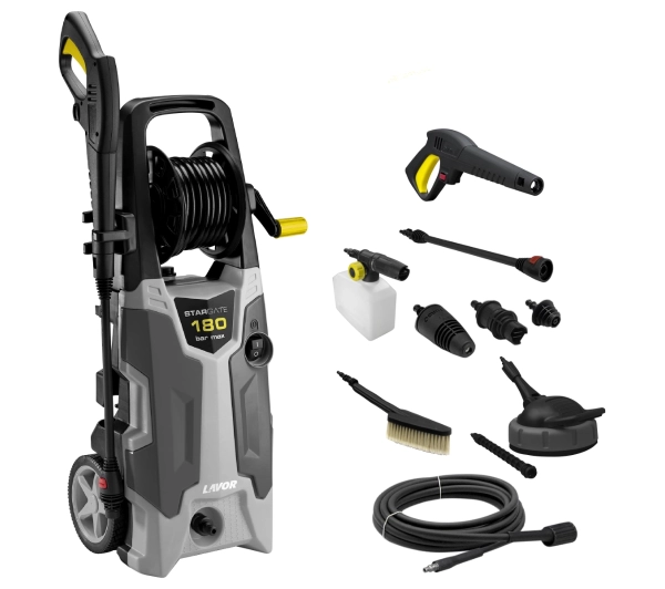 <h2>Lavor Stargate 180</h2>Szukasz dobrej jakości myjki ciśnieniowej? Lavor Stargate 180 bez problemu poradzi sobie nawet z uciążliwymi zabrudzeniami! Urządzenie zostało wyposażone w solidny silnik szczotkowy o mocy 2500 W, który zapewnia wysoką wydajność czyszczenia.Perfekcyjne rezultaty czyszczenia dzięki mocy silnika 2500 W i maksymalnemu ciśnieniu wody 180 barówAutomatyczny System Stop zatrzymuje silnik po zwolnieniu przycisku pistoletu Szeroka gama akcesoriów ułatwia wykonywanie różnych zadań wokół domuOdpowiednia do czyszczenia pojazdów, chodników, elewacji, narzędzi i mebli ogrodowych<h2>Poznaj myjkę ciśnieniową Lavor Stargate 180</h2> Wyjątkowa moc czyszczeniaNiezależnie od tego, czy chcesz umyć na błysk samochód, czy odświeżyć płytki tarasowe, z myjką ciśnieniową Lavor Stargate 180 możesz zrobić to szybko i skutecznie. Urządzenie wykorzystuje strumień wody pod ciśnieniem maksymalnym 180 barów, dzięki czemu potrafi rozprawić się nawet z uporczywym brudem. Silnik o mocy 2500 W zapewnia stabilne działanie i długą żywotność sprzętu. Bezpieczna pracaProducent wyposażył myjkę w Automatyczny System Stop, który dba o jej bezpieczną pracę. Gdy ASS wykryje, że spust pistoletu nie jest używany, automatycznie wyłącza silnik. Takie rozwiązanie zmniejsza ryzyko przegrzania i uszkodzenia sprzętu, a także pozwala zaoszczędzić energię. Myjka zużywa prąd tylko wtedy, gdy z niej korzystasz. Bogate wyposażenieWraz z urządzeniem Lavor Stargate 180 otrzymasz praktyczne wyposażenie, które przyda ci się podczas różnych prac w ogrodzie i wokół domu. W zestawie znajdziesz między innymi okrągłą szczotkę do czyszczenia tarasu, kostki brukowej i płytek na balkonie. Natomiast płaską szczotkę możesz wykorzystać do mycia felg czy plastikowych elementów samochodu. Szerokie zastosowaniePrzekonaj się, jak szybkie i bezproblemowe może być mycie samochodu, elewacji, chodnika czy sprzętów ogrodowych! Lavor Stargate 180 nadaje się do czyszczenia większości powierzchni. Skutecznie usuwa z nich kurz, plamy z oleju, zaschnięte błoto, naloty glonu czy innego rodzaju zabrudzenia. To niezastąpione narzędzie w każdym gospodarstwie domowym.Zawartość opakowania Lavor Stargate 180W opakowaniu Myjka ciśnieniowa 2 dysze Bęben na wąż Dysza Turbo Lanca Pianownica Pistolet Przedłużka Szczotka Szczotka do tarasów Wąż wysokociśnieniowy Instrukcja obsługiLavor - marka godna zaufania Wiele lat na rynkuWłoska firma założona w 1975 rokuZaufany producentMarka specjalizuje się w produkcji urządzeń czyszczących do użytku domowego i profesjonalnegoMiędzynarodowy zasięgProdukty marki są dostępne w sprzedaży na kilku kontynentach w około 130 krajach