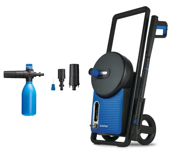Wyposażenie: adapter do węża ogrodowego, bęben na wąż, dysza 3w1, dysza samochodowa, instrukcja obsługi, karta gwarancyjna, lanca, pianownica, pistolet, schowek na narzędzia, wąż wysokociśnieniowy