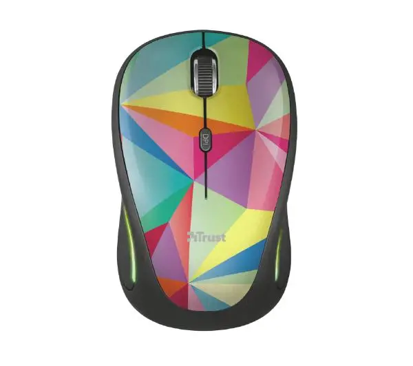 Trust Yvi - bezprzewodowa mysz ze wzorem w kształy geometryczne Design i wygodaBezprzewodowa mysz Trust Yvi łączy w sobie niezwykłą funkcjonalność z ciekawym wyglądem. Jej kompaktowy kształt sprawia, że jest idealnym towarzyszem podróży. Możesz ją trzymać w torbie na laptopa lub dowolnej kieszeni, zmieści się wszędzie. Dodatkowo mysz illuminuję.Technologia bezprzewodowaMysz działa bezprzewodowo w zasięgu 8 metrów za pośrednictwem przenośnego odbiornika USB. Kiedy tylko podłączysz ten mały odbiornik do laptopa lub komputera od razu możesz zacząć używać myszy. Gdy skończysz, możesz po prostu zostawić odbiornik w komputerze lub laptopie albo schować go w schowku w myszy. Jeśli chcesz oszczędzać baterię, w każdej chwili możesz włączać lub wyłączać mysz za pomocą przełącznika zasilania.Stworzona dla każdegoYvi pozwala wybrać ulubioną prędkość kursora za pomocą przycisku wyboru prędkości (800/1600 DPI). Myszka jest oburęczna, co oznacza, że może być używana zarówno przez osoby praworęczne, jak i leworęczne. Każdy może czerpać przyjemność z korzystania z Yvi.