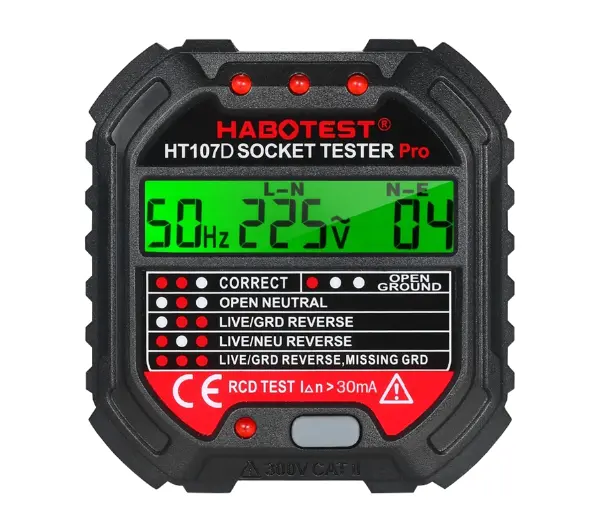 <h2>Tester gniazd z wyświetlaczem cyfrowym Habotest HT107D</h2><p>Habotest HT107D to kompaktowy i funkcjonalny tester gniazd, który pomaga zwiększyć bezpieczeństwo użytkowania sprzętów elektrycznych w domu, biurze czy miejscach pracy. Wyposażony w wyświetlacz cyfrowy oraz wskaźnik LED, dostarcza kluczowych informacji o stanie połączeń. Powiadomi Cię o braku uziemienia oraz umożliwia wykonanie testu RCD, chroniąc przed ryzykiem uszkodzenia urządzeń i zagrożeniami związanymi z nieprawidłowym podłączeniem.</p> <h2>Jasny wyświetlacz cyfrowy i wskaźnik LED</h2><p>HT107D wyposażony jest w czytelny wyświetlacz LCD, który ułatwia odczyt wyników. Umieszczone na testerze diody LED wskazują status połączenia, sygnalizując ewentualne nieprawidłowości za pomocą odpowiednich kombinacji. Dzięki temu szybko dowiesz się, czy gniazdo jest poprawnie uziemione, czy istnieje ryzyko wystąpienia prądu na przewodzie neutralnym, itp. Tester pozwala również na łatwe przeprowadzenie testu RCD – wystarczy nacisnąć dedykowany przycisk.</p> <h2>Wszechstronność i mobilność</h2><p>Habotest HT107D to wszechstronne narzędzie, które sprawdzi się w wielu zastosowaniach: od testowania gniazd w domach i biurach, po sprawdzanie listew zasilających oraz gniazd przemysłowych. Jego kompaktowa, lekka konstrukcja umożliwia wygodne przenoszenie i przechowywanie w torbie czy plecaku, co czyni go idealnym rozwiązaniem dla profesjonalistów i użytkowników domowych.</p>
