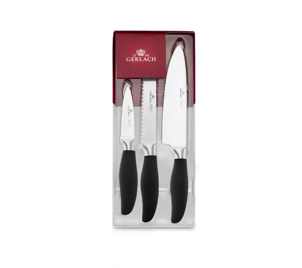 <p>Noże Style to fantastyczna propozycja dla osób, które poszukują nowoczesnych rozwiązań w kuchni oraz produktów, wyróżniających się modnym, minimalistycznym wzornictwem</p><p>Noże wykonane ze stali nierdzewnej X30Cr13 z dodatkiem chromu, który zwiększa odporność na korozję. Twardość ostrza noża Smart Grey na skali Rockwella wynosi 52-54 HRC co zapewnia precyzyjne i ostre cięcie.</p><p>Stalowa rękojeść pokryta powłoką typu Soft Touch , która posiada antypoślizgową funkcję. Powłoka to termoplastyczna guma, która zapobiega wyślizgiwaniu się noża z dłoni, nawet jeśli jest on mokry. Dodatkowo, powłoka zabezpiecza uchwyt przed korozją.</p><p>Gwarancja jakości ostrzy noży Gerlach - trwałość/ ostrość/ elastyczność/ twardość</p><p>Aby noże kuchenne Gerlach jak najdłużej cieszyły nas swoją niezawodnością i pięknym wyglądem, zalecamy myć je ręcznie.</p><p>W skład zestawu wchodzi:</p><ul> <li>Nóż Szefa kuchni 8”</li> <li>Nóż do chleba 8”</li> <li>Nóż do jarzyn 3½” </li></ul>