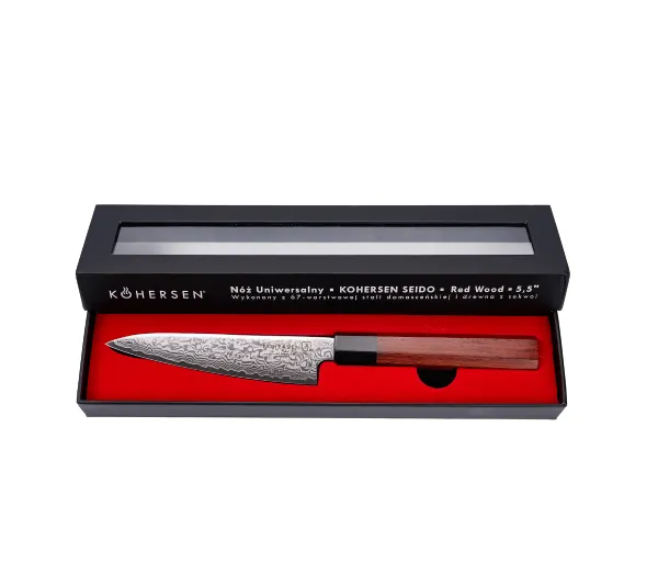 Informacje dodatkowe: Ostrza wykonane z 67‑warstwowej stali damasceńskiej; wzór Raindrop; twardość 60 (±1) HRC; idealnie wyważony; ergonomiczna rękojeść; nie myć w zmywarce