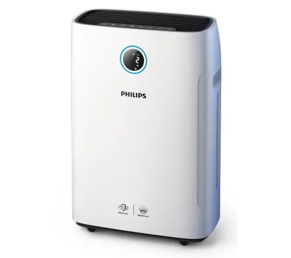 <ul> <li> <p>Usuwa cząsteczki 800x mniejsze od smogu - czyli o wielkości 0,003 μm (mikrometra).*</p> </li> <li> <p>Usuwa do 99.97% zanieczyszczeń w tym smog, wirusy, bakterie, alergeny i szkodliwe gazy.</p> </li> <li> <p>Technologia NanoCloud: higieniczne i naturalne nawilżanie bez osadu i plam.</p> </li> <li> <p>Ultracichy tryb nocny, niezakłócający snu.</p> </li> <li> <p>Niskie zużycie energii: 2W w trybie czuwania, 35W przy pracy z maksymalną mocą.</p> </li></ul><p>*Badanie przeprowadzone przy użyciu cząsteczek o wielkości 0,003 µm przez IUTA zgodnie z normą DIN71460-1 przy zastosowaniu aerozolu NaCl.</p> <h2>Zaawansowana filtracja</h2> <h3>Filtr NanoProtect HEPAusuwa cząsteczki 100x mniejsze niż standardowy filtr HEPA</h3><p>Zaawansowany filtr NanoProtect HEPA potrafi wychwycić nawet 99,97%* cząsteczek o wielkości do 0,003 μm, podczas gdy filtry HEPA (standardowe) wyłapują cząsteczki mierzące 0,3 μm.Dlaczego to takie ważne?Najmniejsze cząsteczki są potencjalnie najgroźniejsze dla zdrowia, ponieważ łatwiej penetrują drogi oddechowe. Ich wielkości wynoszą w przybliżeniu: </p><ul> <li>dla wirusów od 0,020 μm do 1 μm (mikrometra)</li> <li>najmniejsze cząsteczki smogu - poniżej 0,1 μm (mikrometra)</li></ul>Chroń swoich bliskich i siebie przed nadmierną ekspozycją na zanieczyszczenia.<p>*Badanie przeprowadzone przy użyciu cząsteczek o wielkości 0,003 µm przez IUTA zgodnie z normą DIN71460-1 przy zastosowaniu aerozolu NaCl.</p> <h3>Zobacz jak działa filtrowanie4 - etapowy proces filtracji</h3><p>1. Filtr wstępny odpowiedzialny jest za wyłapywanie większych cząsteczek kurzu, w tym większych pyłków oraz drobin zwierzęcej sierści.2. Filtr z aktywnym węglem neutralizuje nieprzyjemne zapachy oraz szkodliwe gazy, w tym lotne związki organiczne.3. Filtr NanoProtect HEPA usuwa cząsteczki smogu PM2,5, alergeny, pyłki roślin, roztocza, zarodniki pleśni i grzybów oraz bakterie i wirusy.4. Filtr NanoCloud nawilża suche powietrze, łącząc je z cząsteczkami wody uwalnia do otoczenia nawilżone powietrze.</p> <p>Tylko oryginalne filtry Philips zapewniają wydajność i skuteczność deklarowaną przez producenta!</p> <h2>Oczyszczaj powietrze za jednymdotknięciem przycisku</h2> <h3>Tryb automatyczny</h3><p>Jakość powietrza jest stale kontrolowana, a oczyszczacz automatycznie dostosowuje tryb pracy do aktualnego zapotrzebowania.</p><h3>Tryb antyalergenowy</h3><p>Najskuteczniej wychwytuje alergeny, jednocześnie dbając o właściwe nawilżenie powietrza, dzięki czemu ułatwia oddychanie i ogranicza kontakt z czynnikami szkodliwymi.</p><h3>Tryb nocny</h3><p>Oczyszczacz 2w1 zmniejsza prędkość pracy wentylatora i ogranicza poziom hałasu. Jednocześnie wyświetlacz zostaje przygaszony, aby światło nie przeszkadzało w wypoczynku.</p> <h3>Natychmiast informuje o jakości powietrza</h3><h3>Dobra jakość powietrza</h3><p>Obecne w powietrzu cząsteczki mniejsze niż 2,5 μm są wykrywane przez czujnik jakości powietrza, a ich liczba wyświetla się w czasie rzeczywistym oraz przedstawiona zostaje kolorami przez wskaźnik LED.</p><p>Wyświetlane przez wskaźnik kolory prezentują jakość powietrza w pomieszczeniach i występują w zakresie od niebieskiego (dobra), przez fioletowy (średnia), różowy (zła), aż do czerwonego (bardzo zła).</p><h3>Natychmiast informuje o jakości powietrza</h3><h3>Średnia jakość powietrza</h3><p>Obecne w powietrzu cząsteczki mniejsze niż 2,5 μm są wykrywane przez czujnik jakości powietrza, a ich liczba wyświetla się w czasie rzeczywistym oraz przedstawiona zostaje kolorami przez wskaźnik LED.</p><p>Wyświetlane przez wskaźnik kolory prezentują jakość powietrza w pomieszczeniach i występują w zakresie od niebieskiego (dobra), przez fioletowy (średnia), różowy (zła), aż do czerwonego (bardzo zła).</p><h3>Natychmiast informuje o jakości powietrza</h3><h3>Zła jakość powietrza</h3><p>Obecne w powietrzu cząsteczki mniejsze niż 2,5 μm są wykrywane przez czujnik jakości powietrza, a ich liczba wyświetla się w czasie rzeczywistym oraz przedstawiona zostaje kolorami przez wskaźnik LED.</p><p>Wyświetlane przez wskaźnik kolory prezentują jakość powietrza w pomieszczeniach i występują w zakresie od niebieskiego (dobra), przez fioletowy (średnia), różowy (zła), aż do czerwonego (bardzo zła).</p><h3>Natychmiast informuje o jakości powietrza</h3><h3>Bardzo zła jakość powietrza</h3><p>Obecne w powietrzu cząsteczki mniejsze niż 2,5 μm są wykrywane przez czujnik jakości powietrza, a ich liczba wyświetla się w czasie rzeczywistym oraz przedstawiona zostaje kolorami przez wskaźnik LED.</p><p>Wyświetlane przez wskaźnik kolory prezentują jakość powietrza w pomieszczeniach i występują w zakresie od niebieskiego (dobra), przez fioletowy (średnia), różowy (zła), aż do czerwonego (bardzo zła).</p> <h2>Ważne informacje na wyświetlaczu</h2> <h3>Wskaźnik cząsteczek PM2.5</h3><p>Oczyszczacz wskazuje aktualne stężenie cząsteczek PM2.5 w powietrzu w μg/m3.</p><h3>Wskaźnik alergenów IAI</h3><p>Wyświetlacz prezentuje poziom alergenów unoszących się w powietrzu w czytelnej skali od 1 do 12.</p><h3>Wskaźnik nawilżania powietrza</h3><p>Elektroniczny wyświetlacz pokazuje mierzony przez czujnik aktualny poziom nawilżenia powietrza.</p><h2>Idealny do pomieszczeń do 40 m2</h2><ul> <li> <p>Zasięg do 40 m2</p> </li> <li> <p>Zintegrowany filtr 3w1: wstępny, NanoProtect HEPA, węglowy</p> </li> <li> <p>Wydajność nawilżania powietrza do 600 ml/h</p> </li></ul> <h2>Zawsze skuteczne oczyszczanie,dzięki specjalnym powiadomieniom</h2><p>O stanie filtrów powiadomi odpowiedni symbol na panelu sterowania. Jeśli filtr wstępny nie zostanie wyczyszczony, a filtry węglowe i NanoProtect HEPA nie zostaną wymienione, po jakimś czasie urządzenie się wyłączy, gdyż oczyszczanie przestanie być efektywne. Dzięki temu masz pewność, że zawsze oddychasz c