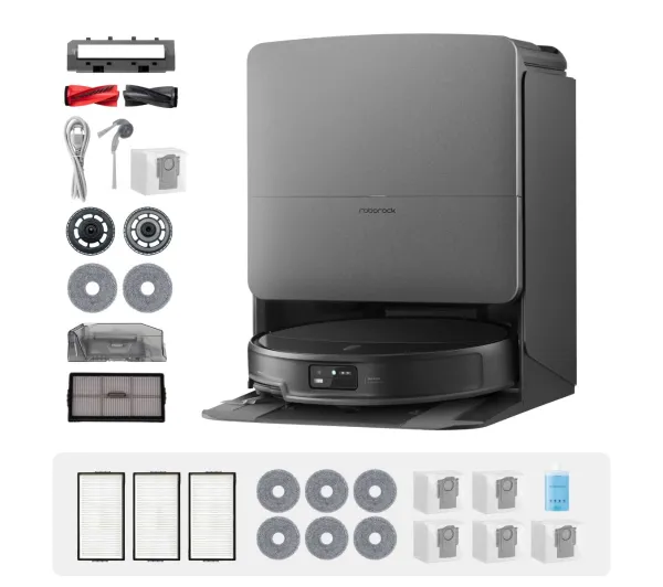 Pozostałe: 4 filtry, 6 worków, 8 padów mopujących, płyn do mycia podłóg, przewód zasilania, stacja samooczyszczająca