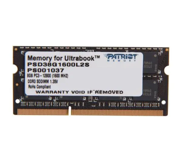 <h2>Patriot DDR3L 8GB 1600 CL11</h2><p>Pamięć RAM Patriot DDR3L w standardzie SO-DIMM umożliwia rozbudowę zasobów w laptopie o 8 GB. Zyskasz z jej pomocą stabilną pracę systemu oraz wygodny dostęp do gier, multimediów czy aplikacji kreatywnych.</p><h2>Poznaj Patriot DDR3L</h2><a></a><h3>SMUKŁY STYL</h3><p>Płynność działania laptopa pozostawia wiele do życzenia? Wymień pamięć RAM na model o pojemności 8 GB i odzyskaj fantastyczny komfort obsługi treści. Dzięki taktowaniu 1600 MHz oraz niskim opóźnieniom CL11 praca nabierze tempa. Unikniesz też irytujących zacięć podczas surfowania w sieci.</p><a></a><h3>DOBRE OSIĄGI</h3><p>Nie ważne czy jesteś graczem, designerem czy pecet służy Ci po prostu do codziennej rozrywki – z Patriot DDR3L uruchomisz dowolną aplikację oraz efektywnie posłużysz się jej narzędziami. Wszystko za sprawą doskonałej przepustowości i niezawodnych układów z wieczystą gwarancją.</p><a></a><h3>NAJWYŻSZA STABILNOŚĆ</h3><p>Pamięć RAM zaprojektowano z myślą o bezproblemowym użytkowaniu komputera w drodze, bez względu na obciążenie robocze. Zoptymalizowany, niski pobór energii pozwala na dłuższe korzystanie z zasilania bateryjnego. Redukuje też skoki temperatury, aby system nie wyłączał się w samym środku ważnego zadania.</p><h2>Pamięć RAM Patriot DDR3L z bliska</h2><h3>1 WIELOZADANIOWA MOC</h3><p>Moduł Patriot DDR3L z 8 GB będzie idealnym wyborem, jeśli chcesz uruchomić kilka programów jednocześnie i przyspieszyć realizację projektu.</p><h3>2 WIĘKSZA WYGODA</h3><p>Wybierz wydajną pamięć RAM, a kopiowanie danych czy wczytywanie plików zajmie znacznie mniej czasu. Zapomnij też o spowolnieniach przy przełączaniu kart przeglądarki internetowej.</p><h3>3 SZYBKA INSTALACJA</h3><p>Do zamocowania Patriot DDR3L wystarczy tylko chwila czasu i swobodny dostęp do slotu DDR3L na płycie głównej laptopa. Kość zostanie skonfigurowana automatycznie przy pierwszym rozruchu.</p><h2>W opakowaniu Patriot DDR3L</h2><h6>1Kość RAM 8 GB</h6><h2>Patriot – marka godna zaufania</h2><p>Wieczysta gwarancja</p><p>Marka specjalizująca się w produkcji pamięci masowych i RAM</p><p>Wieloletnie doświadczenie w rozwoju technologii</p>