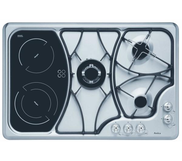 Pola grzewcze: 1 palnik z potrójnym płomieniem, 1 pole ceramiczne, 1 poszerzane pole ceramiczne, 2 palniki gazowe