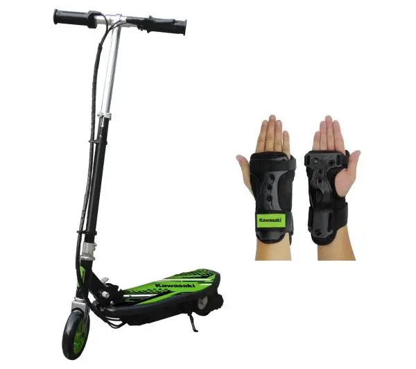 <h3>W zestawie ochraniacze na nadgarstki</h3> <p> </p><h3>Elektryczna hulajnoga Kawasaki KX-FS5.5</h3>Elektryczna hulajnoga Kawasaki to połaczenie swietnej zabawy z praktycznymi zastosowaniami, dla dzieci i młodziezy. Hulajnoga z napedem elektrycznym do łatwego przemieszczania sie z mozliwoscia łatwego złozenia i przenoszenia. Solidnie wykonana i trwała z renoma marki Kawasaki.<p> </p> <p>Odpowiednik klasycznej hulajnogi w nowoczesnym wykonaniu KAWASAKI. Pojazd umozliwia zarówno zabawe jak i efektywne przemieszczanie sie. Silnik elektryczny o mocy 120W zapewnia samodzielny naped hulajnogi z predkoscia do 12km/h. Akumulator o pojemnosci 4.5Ah umozliwia zasieg jazdy do 10 km. Hulajnoga moze byc łatwo i szybko złozona pozwalajac na jej przenoszenie czy przejazd srodkami komunikacji miejskiej.</p>
