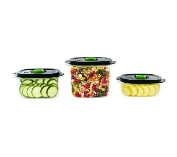 Zestaw 3 pojemników do przechowywania próżniowegoFFC026X poj. 0.7l + 1.18l + 1.8l Wygodne pakowaniepróżniowe w domu Zachowaj świeżość i smak dzięki 2 różnym trybom do wyboru: Tryb próżniowy Pozwala zachować świeżość żywności w lodówce, zamrażarce lub spiżarni. Tryb marynowania Pozwala na marynowanie mięsa, ryb i warzyw w ciągu kilku minut, nie godzin. Zachowaj świeżość żywności do 5 razy dłużej* <p> FoodSaver® jest liderem w kategorii próżniowego pakowania produktów. Dzięki tym urządzeniom Twoja żywność pozostanie świeża do 5 razy dłużej*. </p> Odpowiedni do każdego rodzaju żywności <p> Pojemniki wykonane są z przeźroczystego materiału TritanTM, który jest szczelny, nie zawiera BPA. Pojemniki współpracują ze wszystkimi systemami próżniowymi FoodSaver®. </p> Zobacz porównanie pakowania tradycyjnego oraz próżniowego FoodSaver® Pakowanie tradycyjne Pakowanie próżniowe z FoodSaver® Łatwa obsługa <p> Pojemnniki zostały wyposażone w wygodny wskaźnik podciśnienia, który pokazuje, kiedy powietrze jest usuwane. Wystarczy przekręcić zielone pokrętło na pokrywce na wybrane ustawienie, podłączyć ręczne urządzenie do pakowania próżniowego lub zgrzewarkę próżniową i nacisnąć przycisk pakowania próżniowego. Idealne do przygotowywania posiłków, przechowywania resztek żywności i świeżych produktów! </p> 1 1 Tryb marynowania 2 2 Wskaźnik próżni 3 3 Tryb próżni Specyfikacja produktu <p> BPA-Free </p> <p> Szczelne zamknięcie </p> <p> Możliwość używania w kuchence mikrofalowej i zmywarce </p> <p> Możliwość układania pojemników jeden na drugi dla łatwej organizacji </p> <p> Tryb marynowania pozwala marynować jedzenie w kilka minut, zamiast kilku godzin </p> <p> Wskaźnik podciśnienia pokazuje, czy powietrze zostało usunięte z pojemnika </p> <p> Pojemnik wykonany z TritanuTM - trwałego plastiku odpornego na plamy i zapachy, jak również pęknięcia i zarysowania </p> Najczęściej zadawane pytania Jakie produkty można zapakować przy pomocy urządzeń FoodSaver®? <p> Urządzenia FoodSaver® sprawdzą się do pakowania każdego rodzaju żywności – mięs, warzyw, owoców, a nawet zup, sosów i artykułów suchych. </p> Czy zapakowane próżniowo jedzenie zachowuje wartości odżywcze? <p> Tak. Zapakowane próżniowo produkty zachowują swoją świeżość i wartości odżywcze nawet do 5x dłużej*. Pakowanie próżniowe chroni żywność przed bakteriami, a do tego pozwoli zachować smak i jakość produktów na dłużej. </p> Czego potrzebuję, żeby zapakować próżniowo jedzenie? <p> Poza pojemnikiem na żywność, potrzebujesz jedno z urządzeń do pakowania próżniowego FoodSaver®. Wybierz zgrzewarkę próżniową, kompaktowy system lub ręczne urządzenie do pakowania próżniowego w zależności od potrzeb. </p> Jak długo zapakowane jedzenie pozostaje świeże? <p> FoodSaver® pozwala przechowywać żywność o wiele dłużej, w zależności od produktu. Przykładowo zapakowaną tradycyjnie rybę możesz przechowywać w zamrażalniku maksymalnie do 6 miesięcy, w przypadku zapakowanej próżniowo ryby okres przechowywania wydłuża się aż do 2 lat. </p> <p> * W porównaniu do tradycyjnych metod przechowywania żywności. Porównania zostały oszacowane na podstawie opisów dotyczących przygotowania i przechowywania jedzenia zamieszczonych w instrukcji obsługi FoodSaver®. Dla najlepszych rezultatów mogą być potrzebne dodakowe akcesoria. Niezależne badania National Food Laboratory, 2003. Dane zostały zebrane podczas użytkowania w warunkach domowych. Rezultaty mogą się jednak różnić w zależności od sposobu działania, przechowywania, jakości użytej żywności i rodzaju lodówki. </p>