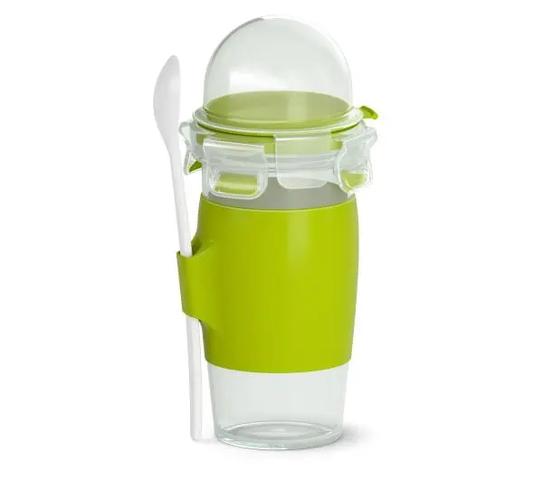 <h2>Tefal MasterSeal To GoN1071410 0,45l</h2><p>Po co przepłacać za jogurt z muesli, skoro możesz przygotować deser z własną mieszanką owoców i orzechów? Zabierz go ze sobą w kubku Tefal MasterSeal N1071410.</p><h2>Poznaj Tefal MasterSeal N1071410</h2><a></a><h3>NIEZAWODNA SZCZELNOŚĆ</h3><p>Nie przepadasz za przenoszeniem żywności w pojemnikach, bo obawiasz się niekontrolowanych wycieków, które ubrudzą torbę, poplamią dokumenty, a nawet zniszczą inne przedmioty? Tefal MasterSeal N1071410 zapobiega takim sytuacjom dzięki szczelnemu wieczku z mocnymi zatrzaskami.</p><a></a><h3>100% WYGODY POZA DOMEM</h3><p>Kubek na jogurt z muesli zapewnia bezpieczne przenoszenie posiłku w torbie i wygodne jedzenie poza domem. Zielona otoczka z tworzywa sztucznego jest przyjemna w dotyku i ma właściwości antypoślizgowe, a specjalny otwór umożliwia zamocowanie łyżeczki z długim trzonkiem. Ten model sprawdza się zarówno w pracy, jak i na urlopie.</p><a></a><h3>POJEMNIK NA PŁATKI</h3><p>Uwielbiasz połączenie jogurtu naturalnego ze słodkim muesli, ale przechowywanie posiłku w jednym pojemniku sprawia, że płatki nasiąkają jogurtem i tracą chrupkość? Poznaj rozwiązanie – Tefal MasterSeal N1071410 0,45 l z wieczkiem odgrywającym rolę pojemniczka na płatki. Dzięki tej konstrukcji możesz wymieszać muesli z jogurtem tuż przed porą drugiego śniadania.</p><h2>Kubek Tefal MasterSeal N1071410 z bliska</h2><h3>1 UCHWYT NA ŁYŻECZKĘ</h3><p>Ile razy zdarzyło Ci się wziąć posiłek na wynos, ale zapomnieć o sztućcach? Dzięki kubkowi Tefal MasterSeal N1071410 z uchwytem nie zapomnisz o łyżeczce. Model z zestawu ma długi trzonek, pozwalający na wygodne jedzenie posiłku z głębokiego kubka.</p><h3>2 DUŻA POJEMNOŚĆ</h3><p>Kubek ma optymalną pojemność dla osób, które uważają, że 250 ml deseru to stanowczo za mało, a więcej niż 500 ml to za dużo. 450 ml jogurtu z muesli wystarczy Ci przynajmniej na jeden posiłek.</p><h3>3 TWORZYWO BEZ BPA</h3><p>Kubek na jogurt Tefal MasterSeal N1071410 jest wykonany z tworzywa sztucznego pozbawionego BPA (Bisfenolu A). W efekcie masz pewność, że posiłki nie mają bezpośredniego kontaktu ze szkodliwymi substancjami.</p><h2>W opakowaniu Tefal MasterSeal N1071410</h2><h6>1Kubek 0,45 l</h6><h6>2Łyżeczka</h6><h2>Tefal – marka godna zaufania</h2><p>Francuski producent technologii ułatwiających gotowanie</p><p>6500 punktów serwisowych na całym świecie i dostęp do części zamiennych przez 10 lat</p><p>Producent artykułów gospodarstwa domowego od 1956 roku</p>