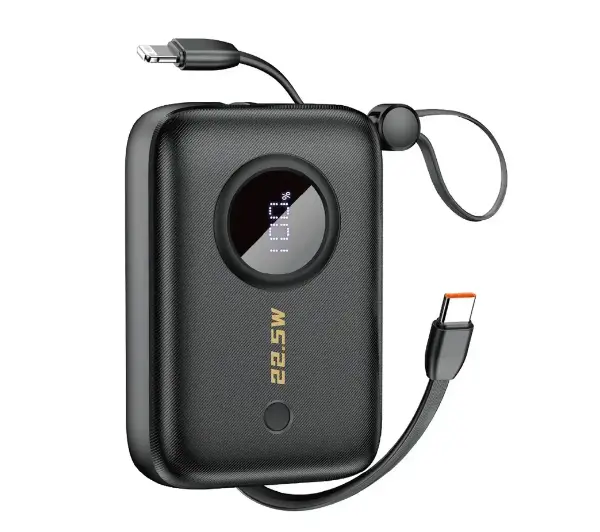 Wbudowany kabel eliminuje konieczność noszenia dodatkowych przewodów. Wystarczy podłączyć urządzenie bezpośrednio do telefonu czy tabletu, aby od razu rozpocząć ładowanie. To wygodne udogodnienie w podróży, w pracy czy na uczelni – mniej akcesoriów do zabrania i pewność, że kabel zawsze jest pod ręką.