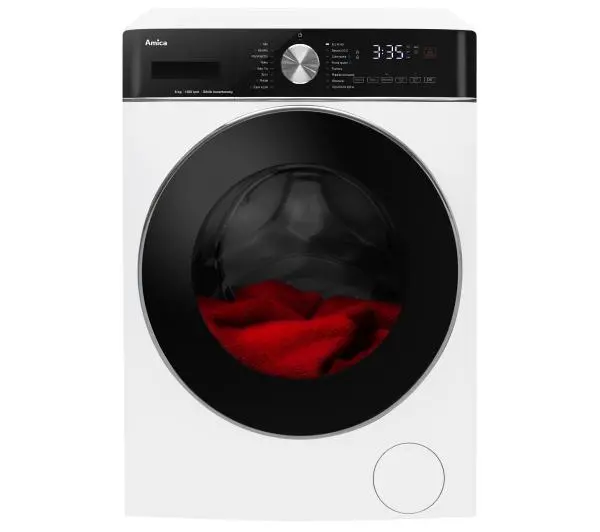 Zastosowane technologie: dobór ilości wody do załadunku Amica Auto Sensor, parowe wygładzanie Amica SteamPower Pro, silnik bezszczotkowy Amica Logic Drive 3.0