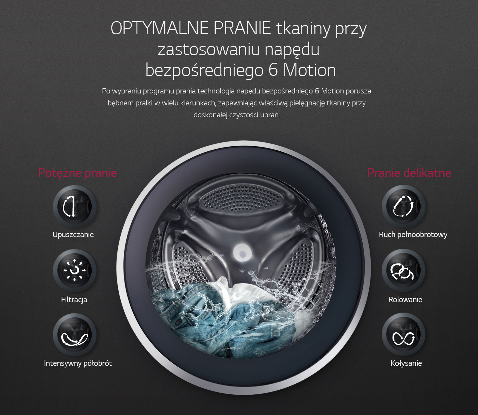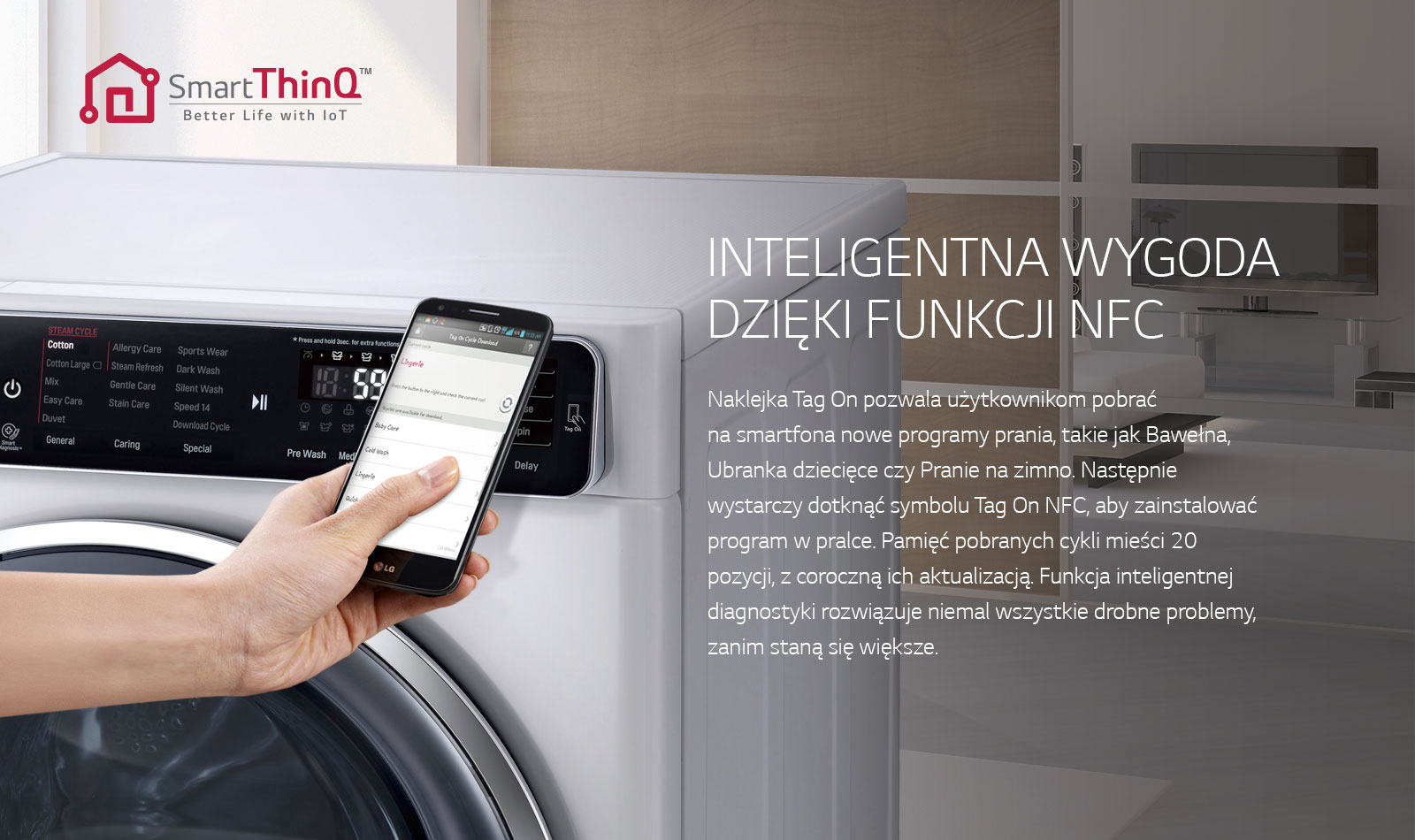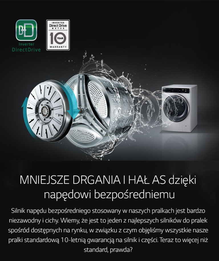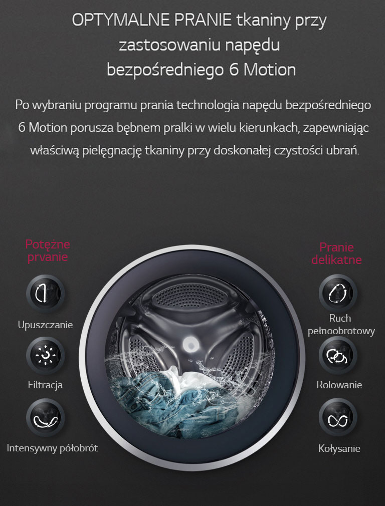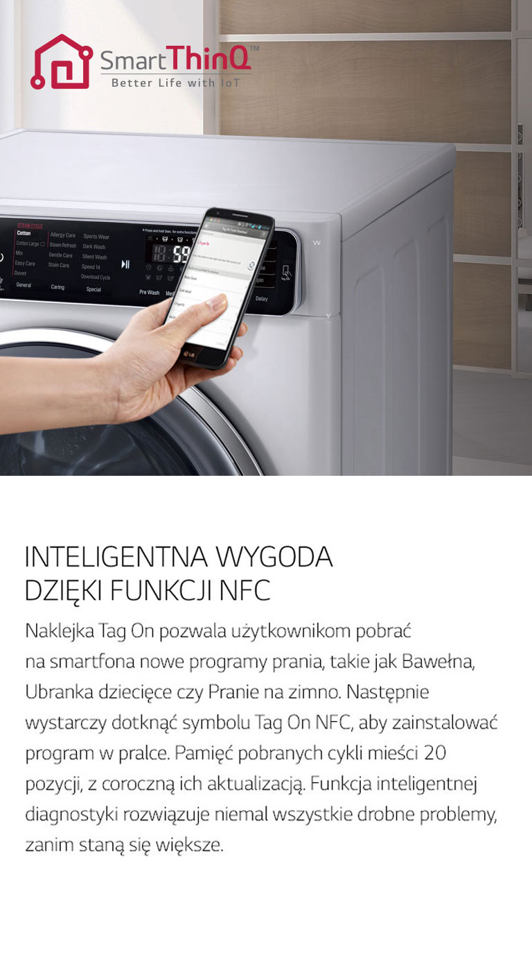 Zastosowane technologie: dostosowanie ruchów bębna do załadunku LG 6Motion Direct Drive, LG "Tag On" przez NFC, silnik bezpośredniego napędu LG DirectDrive, szybsze pranie LG TurboWash™