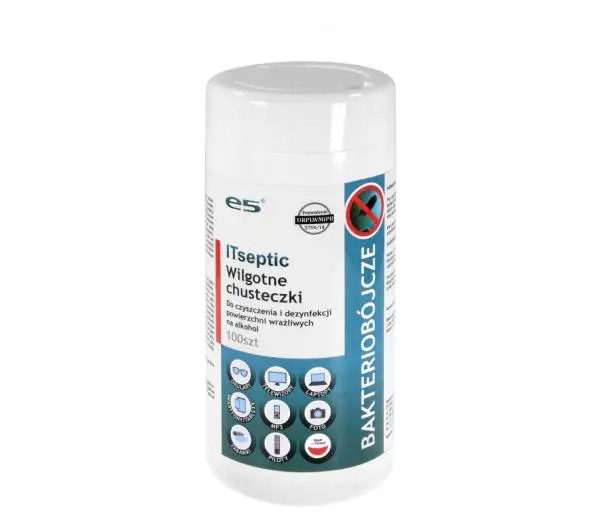 Bakteriobójcze wilgotne chusteczki do czyszczenia i dezynfekowania powierzchni wrażliwych na alkohol takich jak: ekrany LCD/PLASMA/OLED w tym ekrany dotykowe, obudowy smartfonów, tabletów, notebooków. Przeznaczony także do dezynfekcji sprzętów i powierzchni w biurach, placówkach edukacyjnych i rekreacyjnych (klub fitness, solaria).<h2>Karta Charakterystyki</h2>Dane dotyczące dostawcy karty charakterystykiZakład pracy:E5 Polska Sp. z o. o.ul. Wąwozowa 11, 02-796 WarszawaTelefon:+48 22 228 20 90, +48 22 649 17 33, +48 608 526 744Osoba odpowiedzialna za kartę charakterystyki: jj@e5.plSKŁAD / INFORMACJA O SKŁADNIKACHNiebezpieczne składniki w rozumieniu dyrektywy EWG 67/548 i rozporządzenia CLP oraz powiązana klasyfikacja:<ul> <li>< 0,1% - czwartorzędowe związki amoniowe, benzylo-C12-16-alkilodimetylo, chlorki</li> <li>< 0,1% - chlorek didecylodimetyloamonium</li> <li>< 0,1% - czwartorzędowe związki amoniowe, C12-14-alkilo[(etylofenylo)metylo]di-metylowe, chlorki</li></ul><table> <tbody> <tr> <td></td> <td>Niebezpieczeństwa: <ul> <li>R22 Działa szkodliwie po połknięciu.</li> <li>R34 Powoduje oparzenia.</li> <li>R50 Działa bardzo toksycznie na organizmy wodne.</li> <li>H302 Działa szkodliwie po połknięciu.</li> <li>H312 Działa szkodliwie w kontakcie ze skórą.</li> <li>H314Powoduje poważne oparzenia skóry oraz uszkodzenia oczu.</li> </ul> </td> </tr> </tbody></table><a>Szczegółowa Karta Charakterystyki wyrobu.</a>