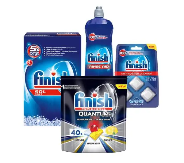 W zestawie: nabłyszczacz 800 ml, sól zmiękczająca 1,5 kg, środek do czyszczenia 3 szt., kapsułki do zmywania 40 szt.