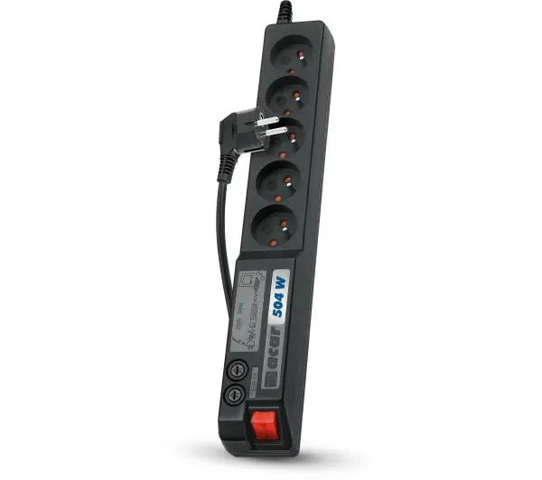 acar 504 W to klasyk w ofercie urządzeń przeciwprzepięciowych firmy HSK DATA, charakteryzujący się dużą trwałością i niezawodnością, potwierdzoną wieloletnią pracą u dziesiątek tysięcy zadowolonych użytkowników. Urządzenie posiada pięć zabezpieczonych gniazd sieciowych 230V z uziemieniem oraz 2 szybkie bezpieczniki topikowe. Dodatkowo, uchwyty mocujące zawarte w zestawie pozwalają na trwały montaż urządzenia w dowolnym, dogodnym miejscu. Podświetlany wyłącznik sieciowy sygnalizuje obecność napięcia w zabezpieczonych gniazdach sieciowych 230V.